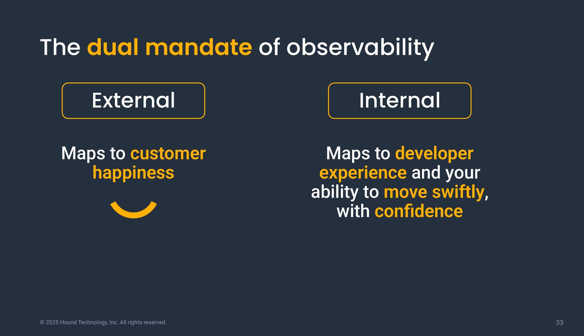 dual mandate of observability Maps to customer happiness External Internal Maps to developer experience and your ability to move swiftly, with confidence