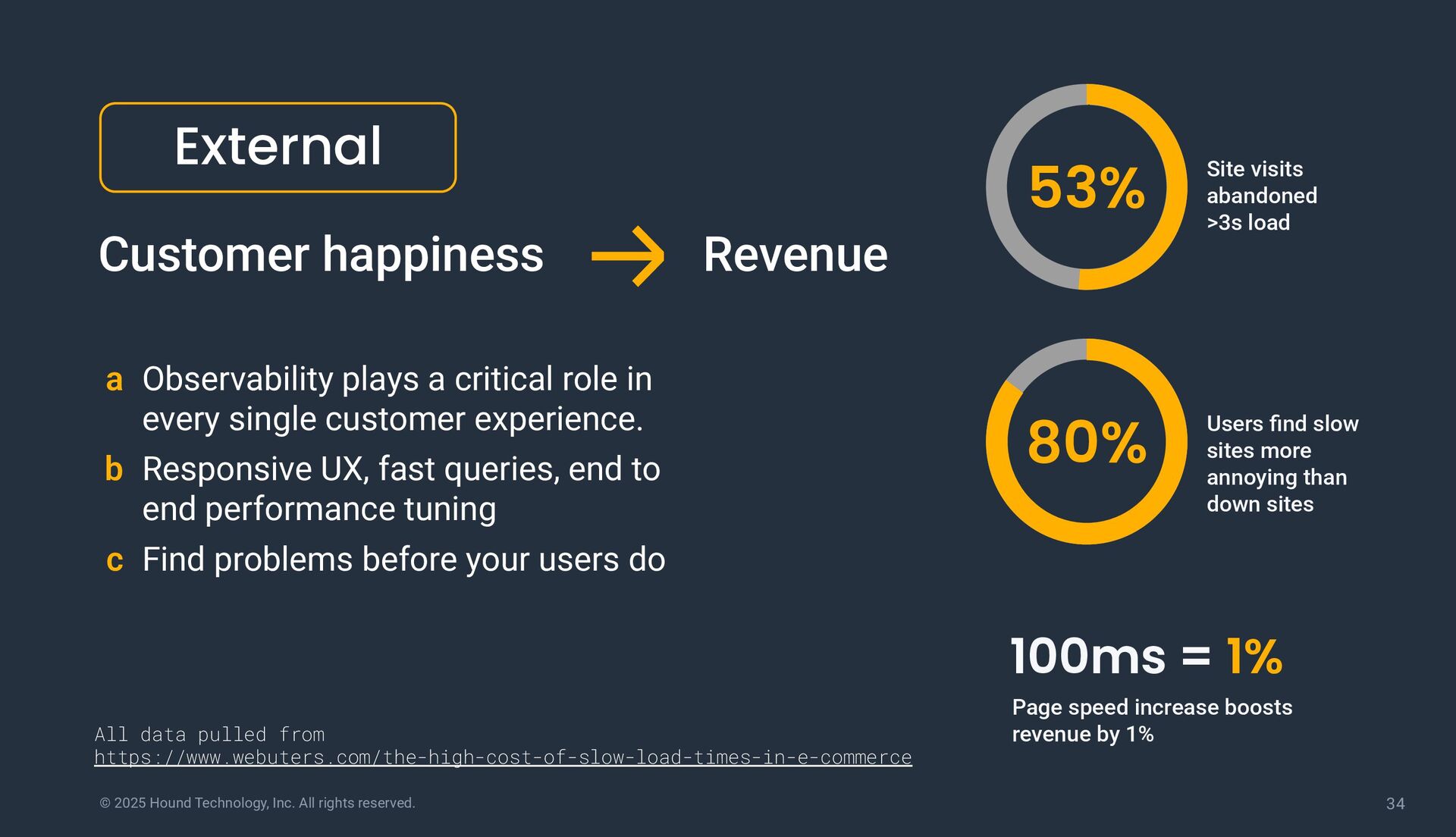 happiness a Observability plays a critical role in every single customer experience. b Responsive UX, fast queries, end to end performance tuning c Find problems before your users do External Revenue 53% Site visits abandoned >3s load 80% Users find slow sites more annoying than down sites 100ms = 1% Page speed increase boosts revenue by 1% All data pulled from https://www.webuters.com/the-high-cost-of-slow-load-times-in-e-commerce