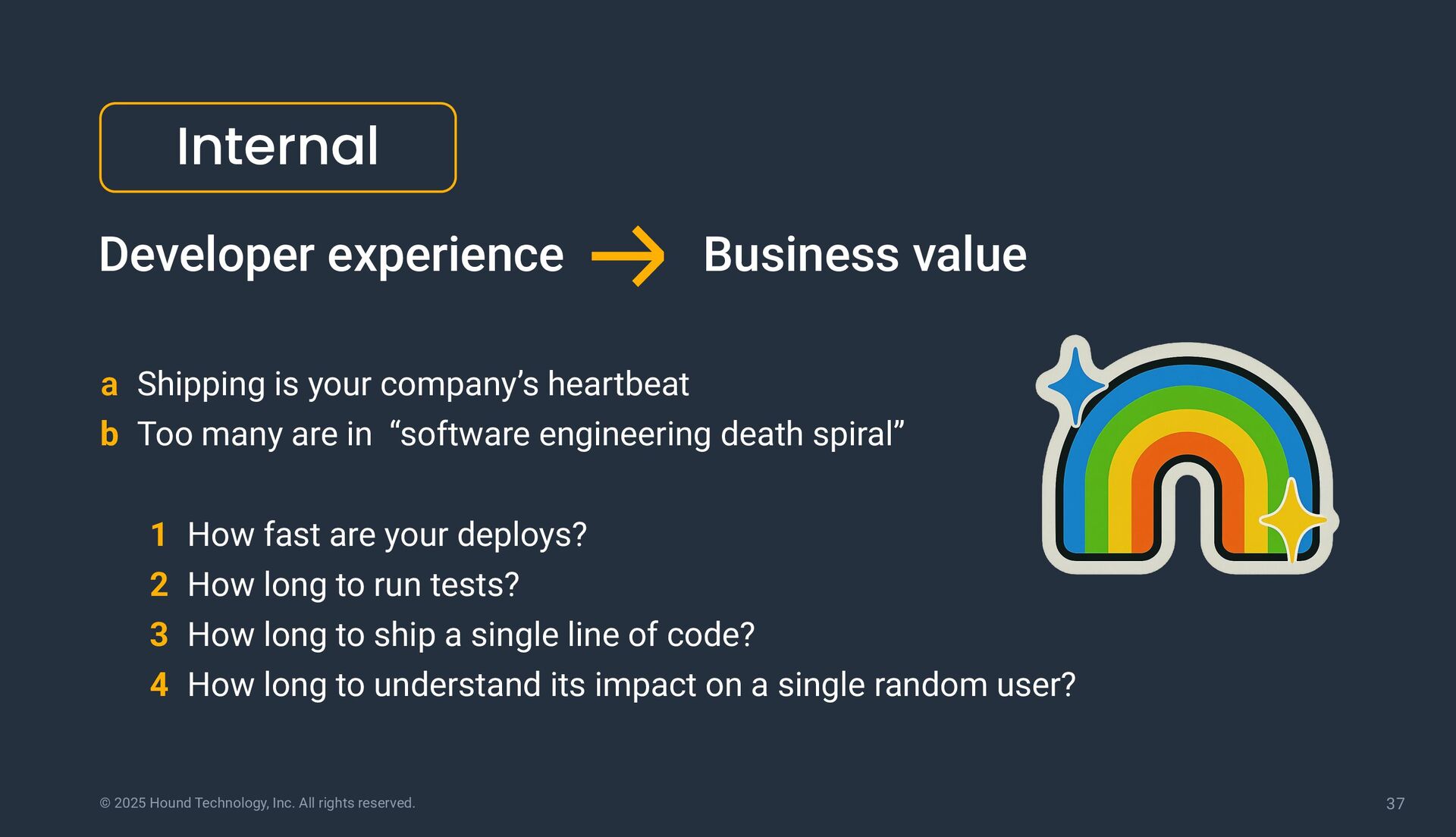 How fast are your deploys? 2 How long to run tests? 3 How long to ship a single line of code? 4 How long to understand its impact on a single random user? a Shipping is your company’s heartbeat b Too many are in “software engineering death spiral” Developer experience Internal Business value