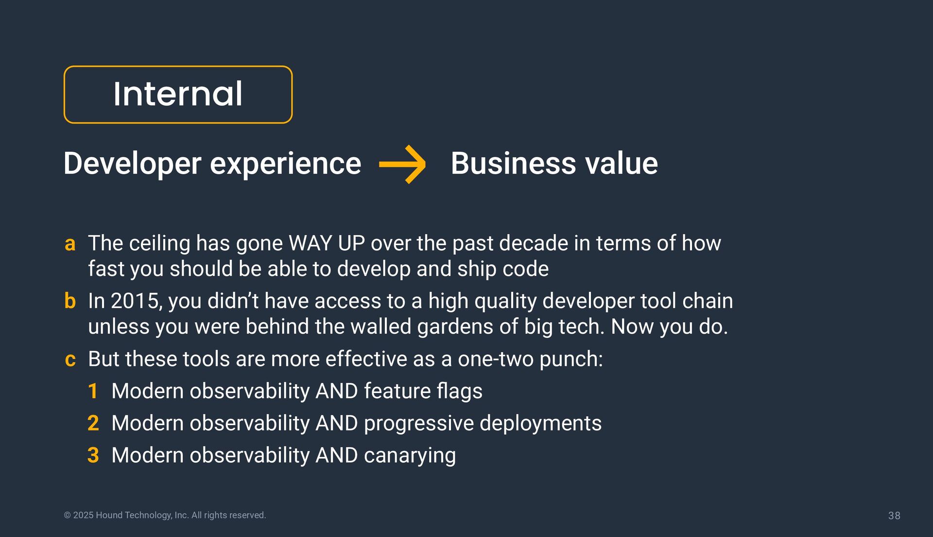 The ceiling has gone WAY UP over the past decade in terms of how fast you should be able to develop and ship code b In 2015, you didn’t have access to a high quality developer tool chain unless you were behind the walled gardens of big tech. Now you do. c But these tools are more effective as a one-two punch: 1 Modern observability AND feature flags 2 Modern observability AND progressive deployments 3 Modern observability AND canarying Developer experience Internal Business value