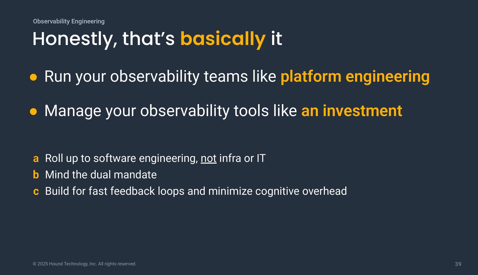 that’s basically it Observability Engineering a Roll up to software engineering, not infra or IT b Mind the dual mandate c Build for fast feedback loops and minimize cognitive overhead • Run your observability teams like platform engineering • Manage your observability tools like an investment
