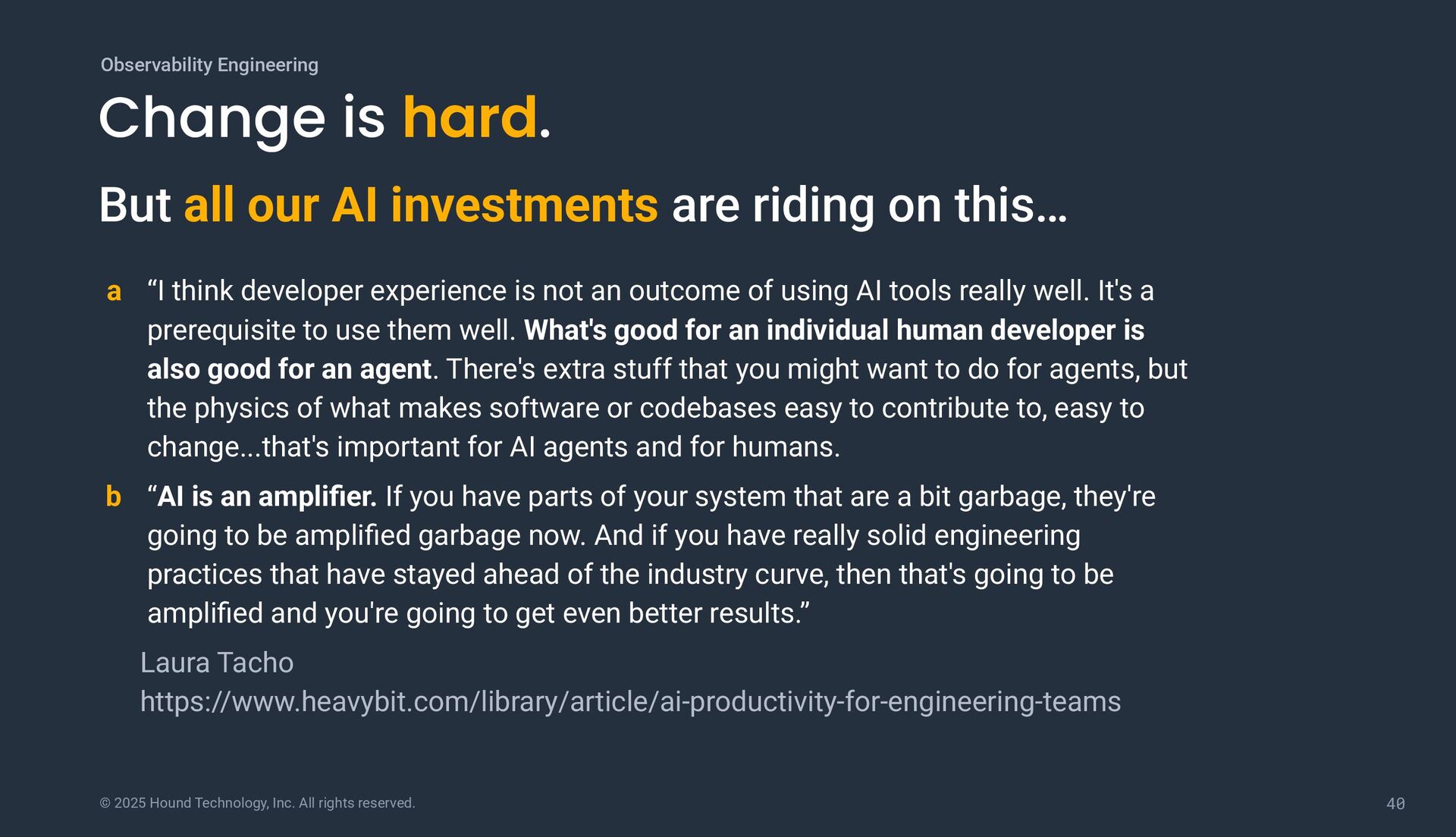is hard. Observability Engineering a “I think developer experience is not an outcome of using AI tools really well. It's a prerequisite to use them well. What's good for an individual human developer is also good for an agent. There's extra stuff that you might want to do for agents, but the physics of what makes software or codebases easy to contribute to, easy to change...that's important for AI agents and for humans. b “AI is an amplifier. If you have parts of your system that are a bit garbage, they're going to be amplified garbage now. And if you have really solid engineering practices that have stayed ahead of the industry curve, then that's going to be amplified and you're going to get even better results.” Laura Tacho https://www.heavybit.com/library/article/ai-productivity-for-engineering-teams But all our AI investments are riding on this…