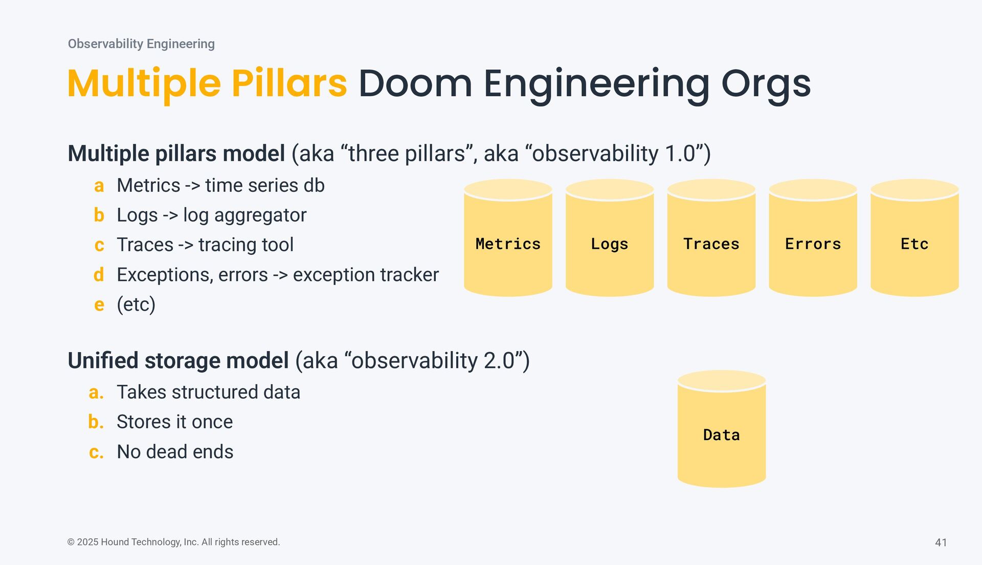 Pillars Doom Engineering Orgs Observability Engineering Multiple pillars model (aka “three pillars”, aka “observability 1.0”) a Metrics -> time series db b Logs -> log aggregator c Traces -> tracing tool d Exceptions, errors -> exception tracker e (etc) Unified storage model (aka “observability 2.0”) a. Takes structured data b. Stores it once c. No dead ends Metrics Logs Traces Errors Data Etc