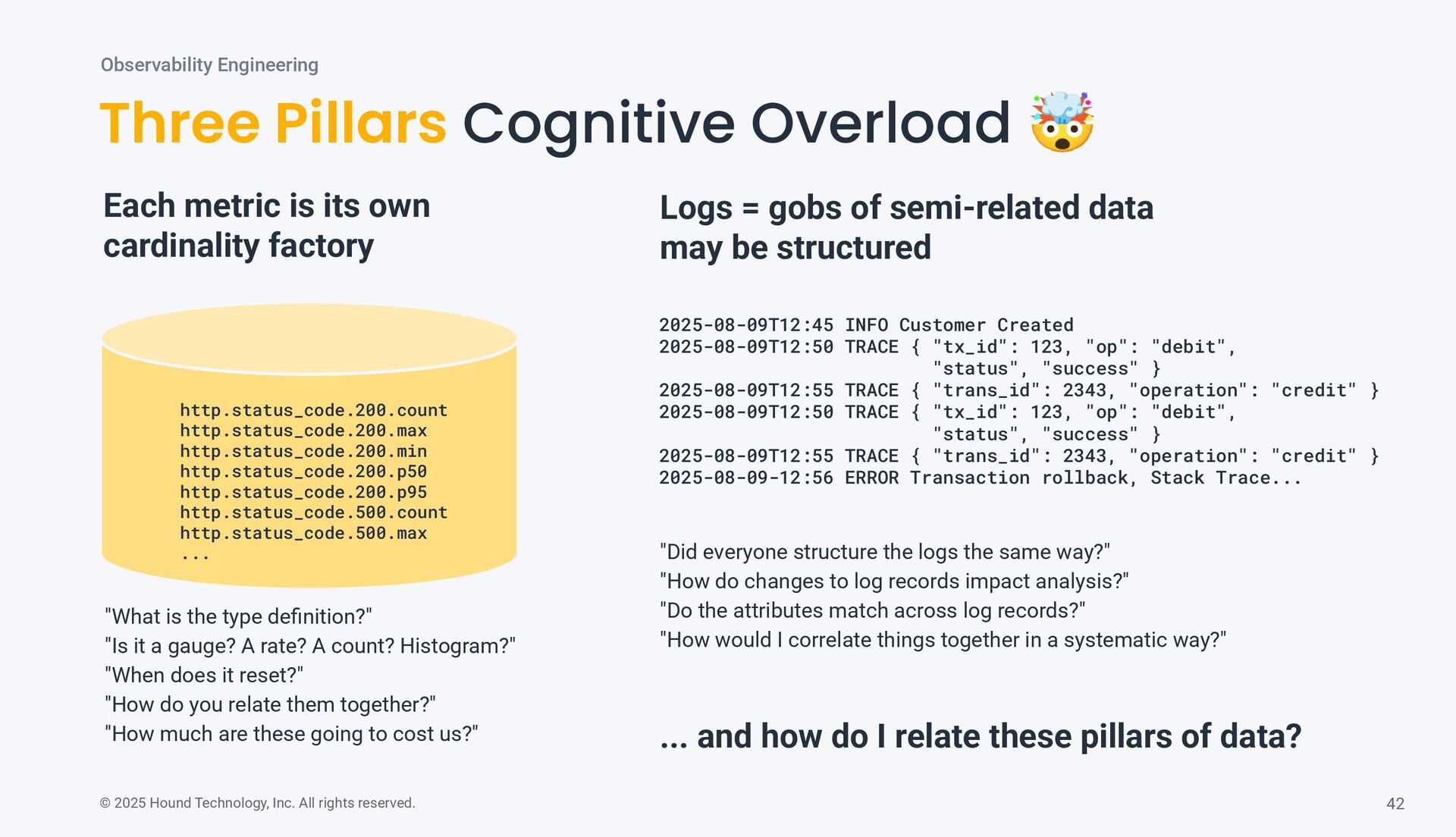 Pillars Cognitive Overload 🤯 Observability Engineering "What is the type definition?" "Is it a gauge? A rate? A count? Histogram?" "When does it reset?" "How do you relate them together?" "How much are these going to cost us?" Each metric is its own cardinality factory Logs = gobs of semi-related data may be structured 2025-08-09T12:45 INFO Customer Created 2025-08-09T12:50 TRACE { "tx_id": 123, "op": "debit", "status", "success" } 2025-08-09T12:55 TRACE { "trans_id": 2343, "operation": "credit" } 2025-08-09T12:50 TRACE { "tx_id": 123, "op": "debit", "status", "success" } 2025-08-09T12:55 TRACE { "trans_id": 2343, "operation": "credit" } 2025-08-09-12:56 ERROR Transaction rollback, Stack Trace... "Did everyone structure the logs the same way?" "How do changes to log records impact analysis?" "Do the attributes match across log records?" "How would I correlate things together in a systematic way?" ... and how do I relate these pillars of data? http.status_code.200.count http.status_code.200.max http.status_code.200.min http.status_code.200.p50 http.status_code.200.p95 http.status_code.500.count http.status_code.500.max ...