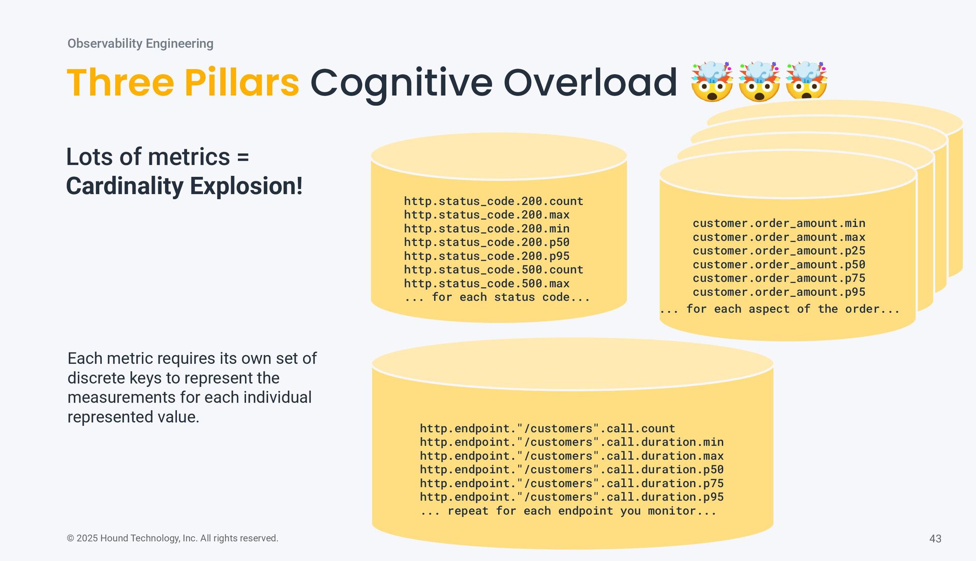 Pillars Cognitive Overload 🤯🤯🤯 Observability Engineering Each metric requires its own set of discrete keys to represent the measurements for each individual represented value. Lots of metrics = Cardinality Explosion! http.status_code.200.count http.status_code.200.max http.status_code.200.min http.status_code.200.p50 http.status_code.200.p95 http.status_code.500.count http.status_code.500.max ... for each status code... customer.order_amount.min customer.order_amount.max customer.order_amount.p25 customer.order_amount.p50 customer.order_amount.p75 customer.order_amount.p95 ... for each aspect of the order... http.endpoint."/customers".call.count http.endpoint."/customers".call.duration.min http.endpoint."/customers".call.duration.max http.endpoint."/customers".call.duration.p50 http.endpoint."/customers".call.duration.p75 http.endpoint."/customers".call.duration.p95 ... repeat for each endpoint you monitor...