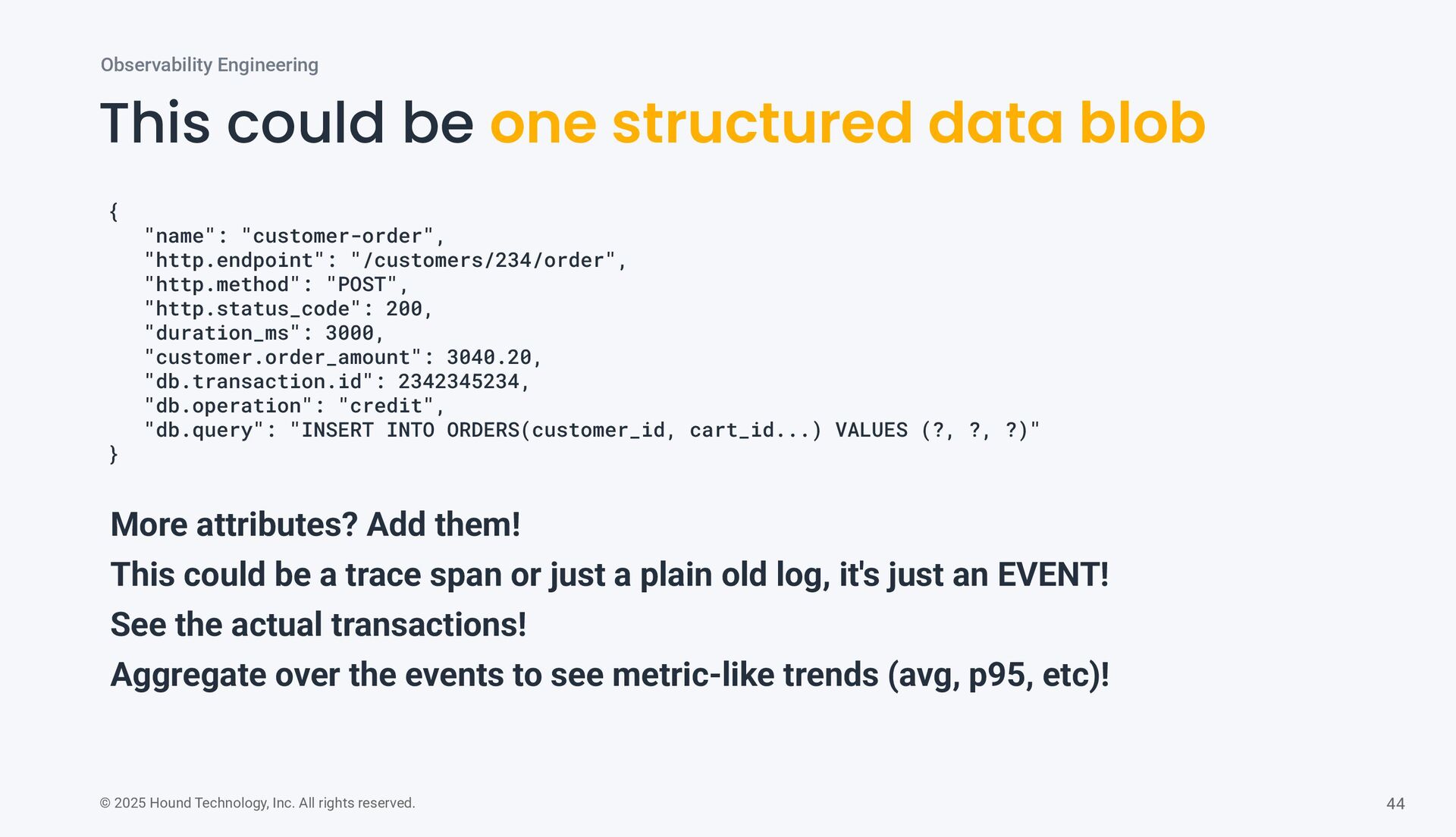could be one structured data blob Observability Engineering { "name": "customer-order", "http.endpoint": "/customers/234/order", "http.method": "POST", "http.status_code": 200, "duration_ms": 3000, "customer.order_amount": 3040.20, "db.transaction.id": 2342345234, "db.operation": "credit", "db.query": "INSERT INTO ORDERS(customer_id, cart_id...) VALUES (?, ?, ?)" } More attributes? Add them! This could be a trace span or just a plain old log, it's just an EVENT! See the actual transactions! Aggregate over the events to see metric-like trends (avg, p95, etc)!