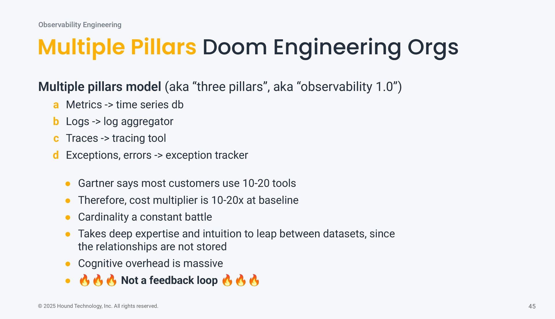 Pillars Doom Engineering Orgs Observability Engineering • Gartner says most customers use 10-20 tools • Therefore, cost multiplier is 10-20x at baseline • Cardinality a constant battle • Takes deep expertise and intuition to leap between datasets, since the relationships are not stored • Cognitive overhead is massive • 🔥🔥🔥 Not a feedback loop 🔥🔥🔥 Multiple pillars model (aka “three pillars”, aka “observability 1.0”) a Metrics -> time series db b Logs -> log aggregator c Traces -> tracing tool d Exceptions, errors -> exception tracker