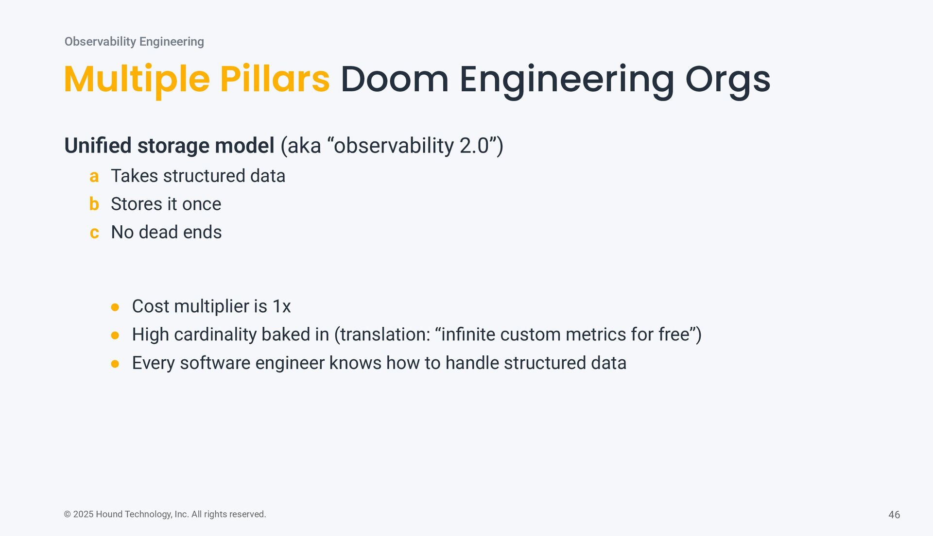 Pillars Doom Engineering Orgs Observability Engineering • Cost multiplier is 1x • High cardinality baked in (translation: “infinite custom metrics for free”) • Every software engineer knows how to handle structured data Unified storage model (aka “observability 2.0”) a Takes structured data b Stores it once c No dead ends