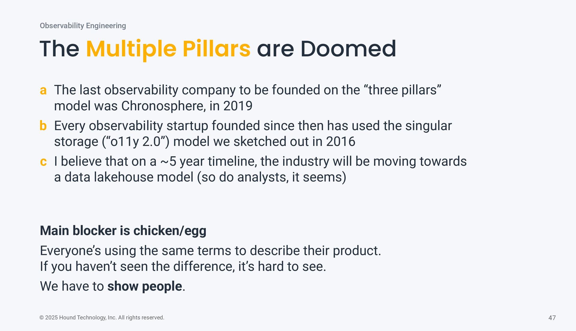Multiple Pillars are Doomed Observability Engineering a The last observability company to be founded on the “three pillars” model was Chronosphere, in 2019 b Every observability startup founded since then has used the singular storage (“o11y 2.0”) model we sketched out in 2016 c I believe that on a ~5 year timeline, the industry will be moving towards a data lakehouse model (so do analysts, it seems) Main blocker is chicken/egg Everyone’s using the same terms to describe their product. If you haven’t seen the difference, it’s hard to see. We have to show people.