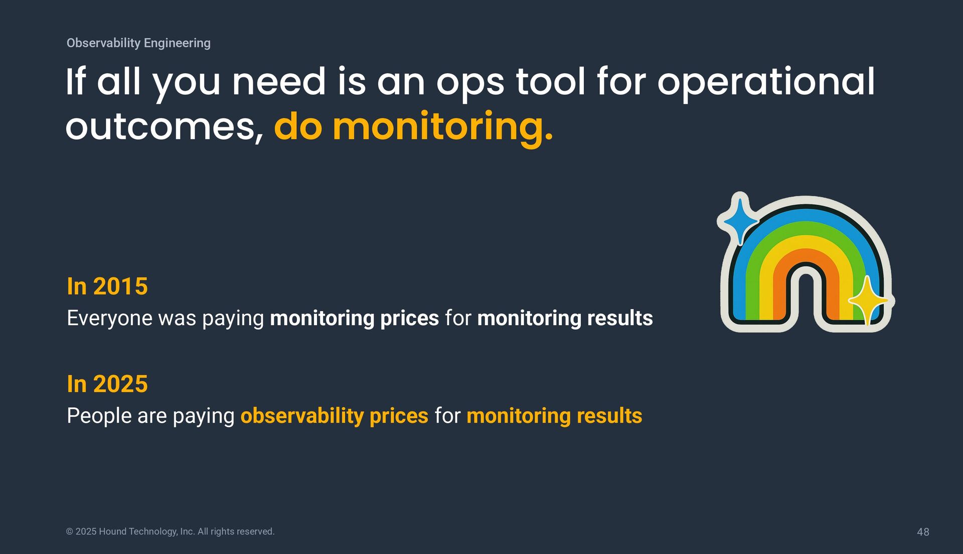 all you need is an ops tool for operational outcomes, do monitoring. Observability Engineering In 2015 Everyone was paying monitoring prices for monitoring results In 2025 People are paying observability prices for monitoring results