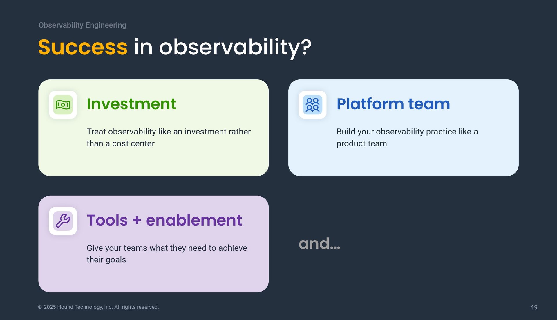 in observability? Observability Engineering Investment Treat observability like an investment rather than a cost center Platform team Build your observability practice like a product team Tools + enablement Give your teams what they need to achieve their goals and…