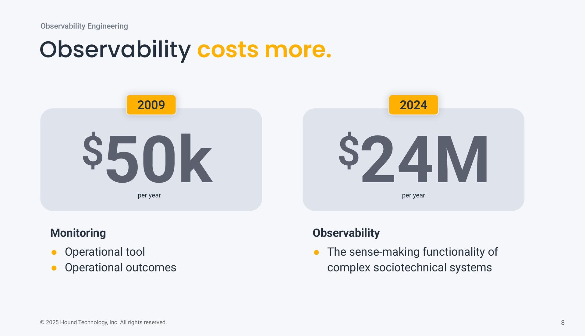 $ 24M $ Observability costs more. Observability Engineering 2009 2024 Monitoring • Operational tool • Operational outcomes Observability • The sense-making functionality of complex sociotechnical systems per year per year