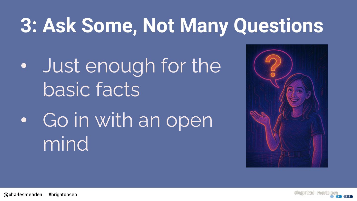 4. @charlesmeaden #brightonseo 3: Ask Some, Not Many Questions • Just