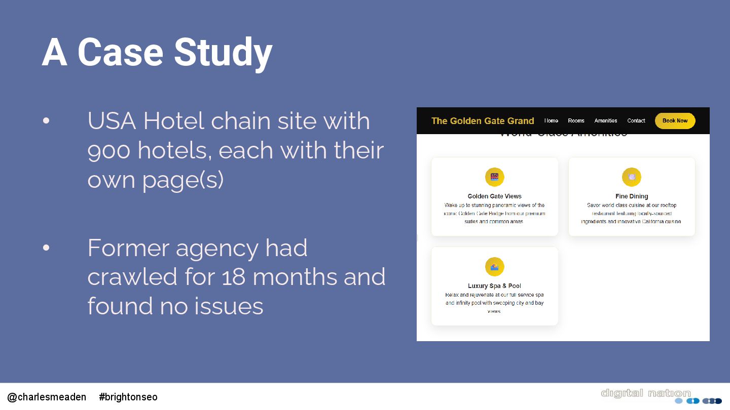with 900 hotels, each with their own page(s) • Former agency had crawled for 18 months and found no issues