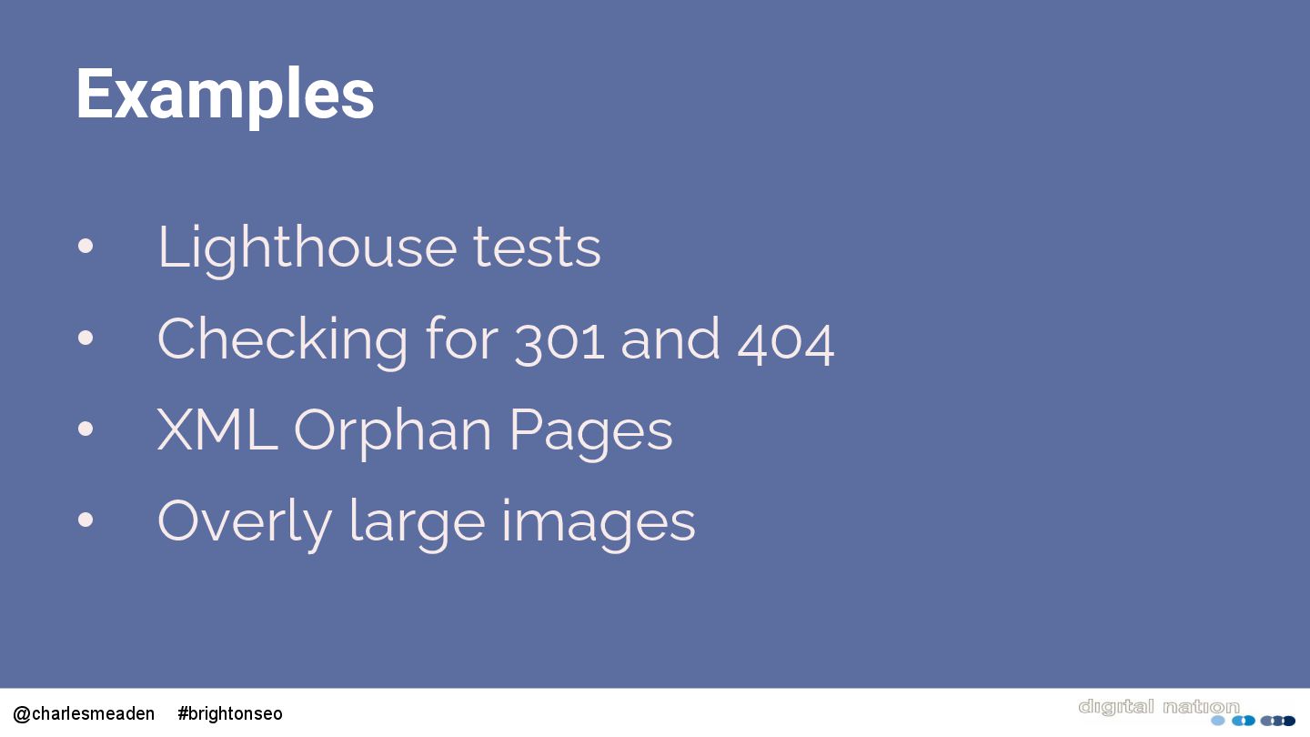 11. @charlesmeaden #brightonseo Examples • Lighthouse tests • Checking for 301