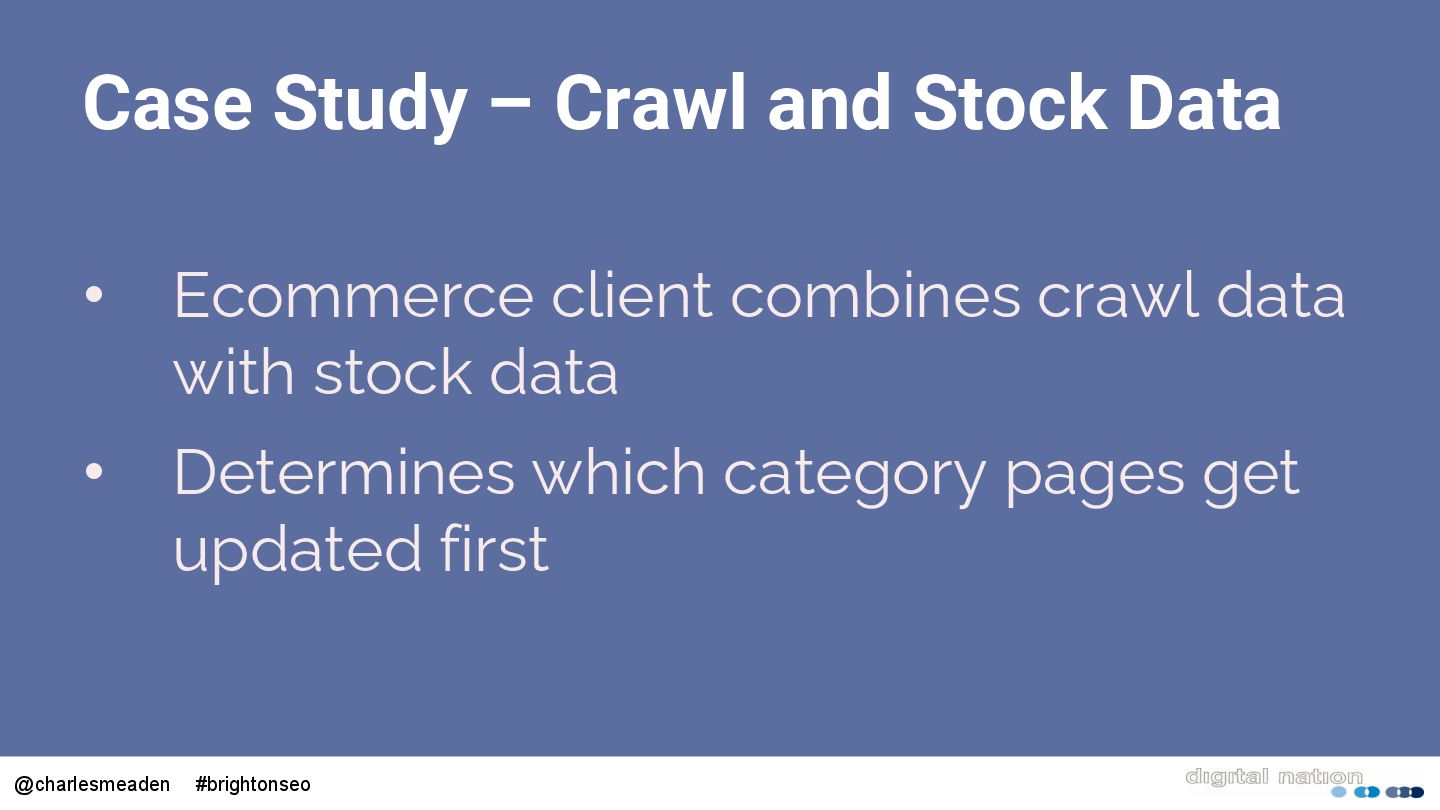Ecommerce client combines crawl data with stock data • Determines which category pages get updated first
