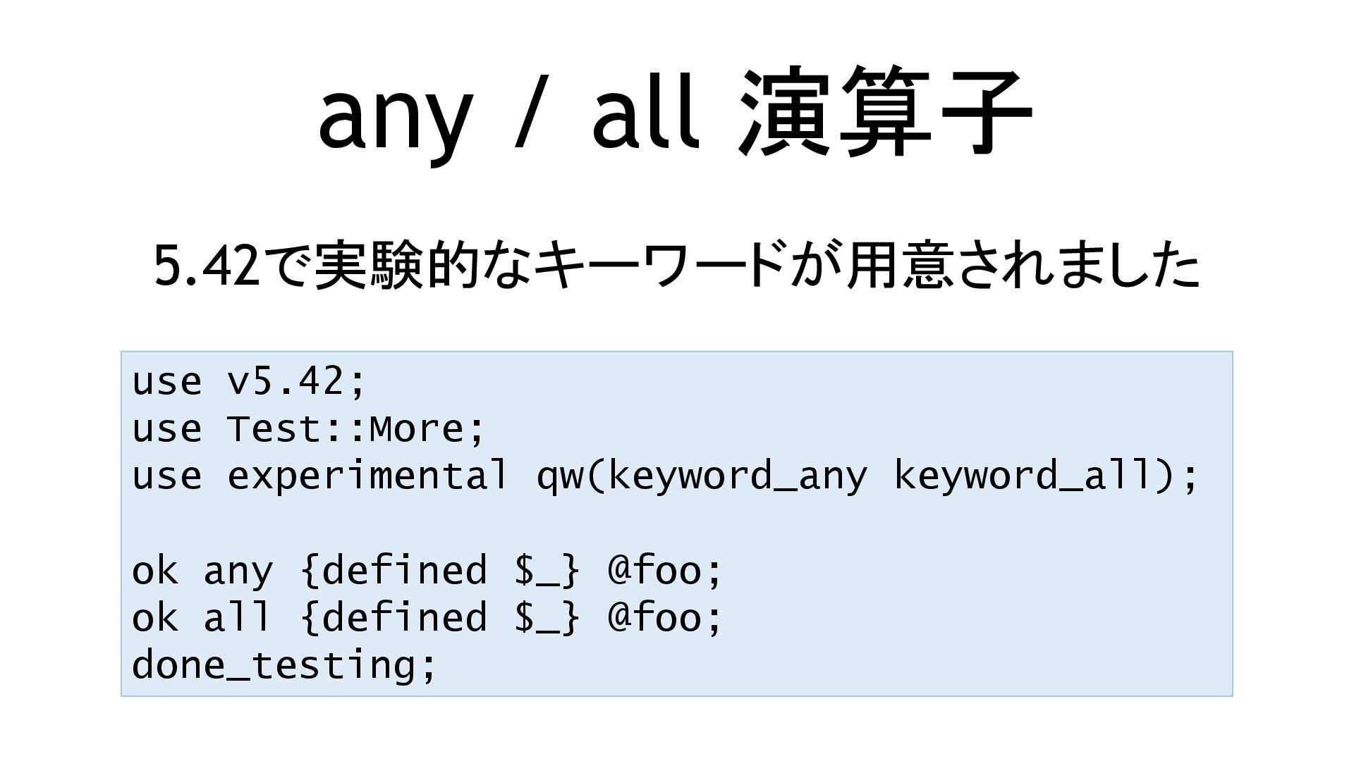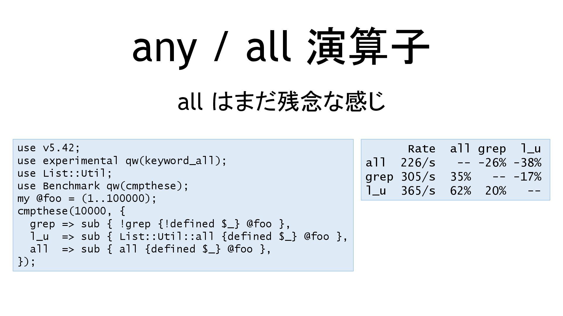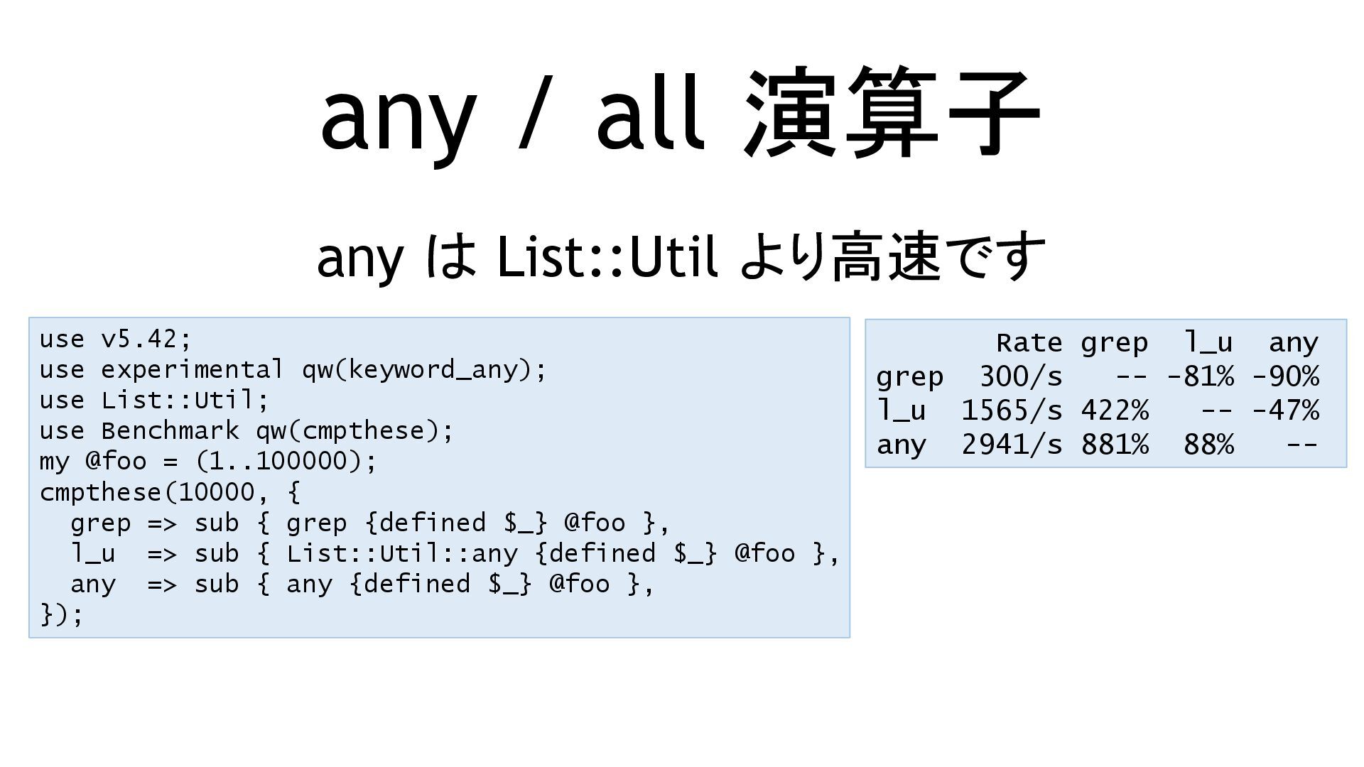 use experimental qw(keyword_any); use List::Util; use Benchmark qw(cmpthese); my @foo = (1..100000); cmpthese(10000, { grep => sub { grep {defined $_} @foo }, l_u => sub { List::Util::any {defined $_} @foo }, any => sub { any {defined $_} @foo }, }); Rate grep l_u any grep 300/s -- -81% -90% l_u 1565/s 422% -- -47% any 2941/s 881% 88% --