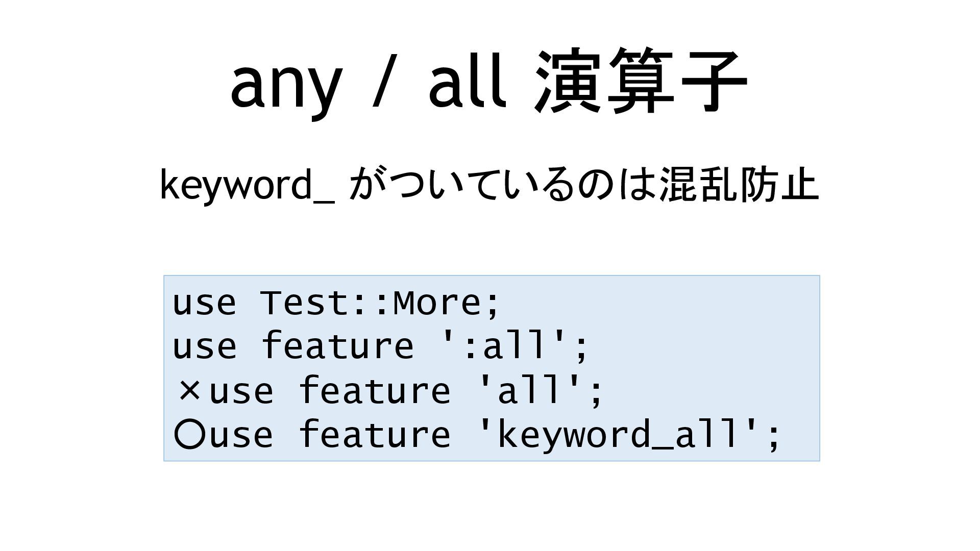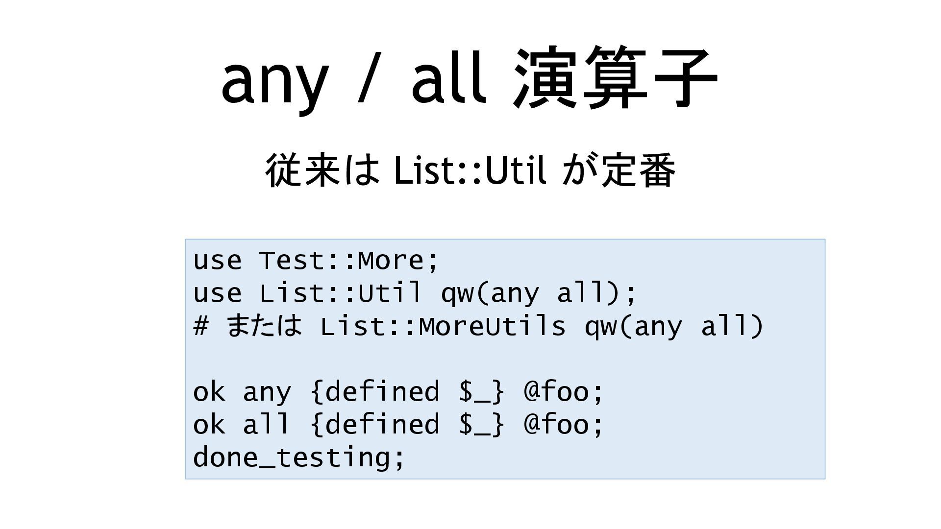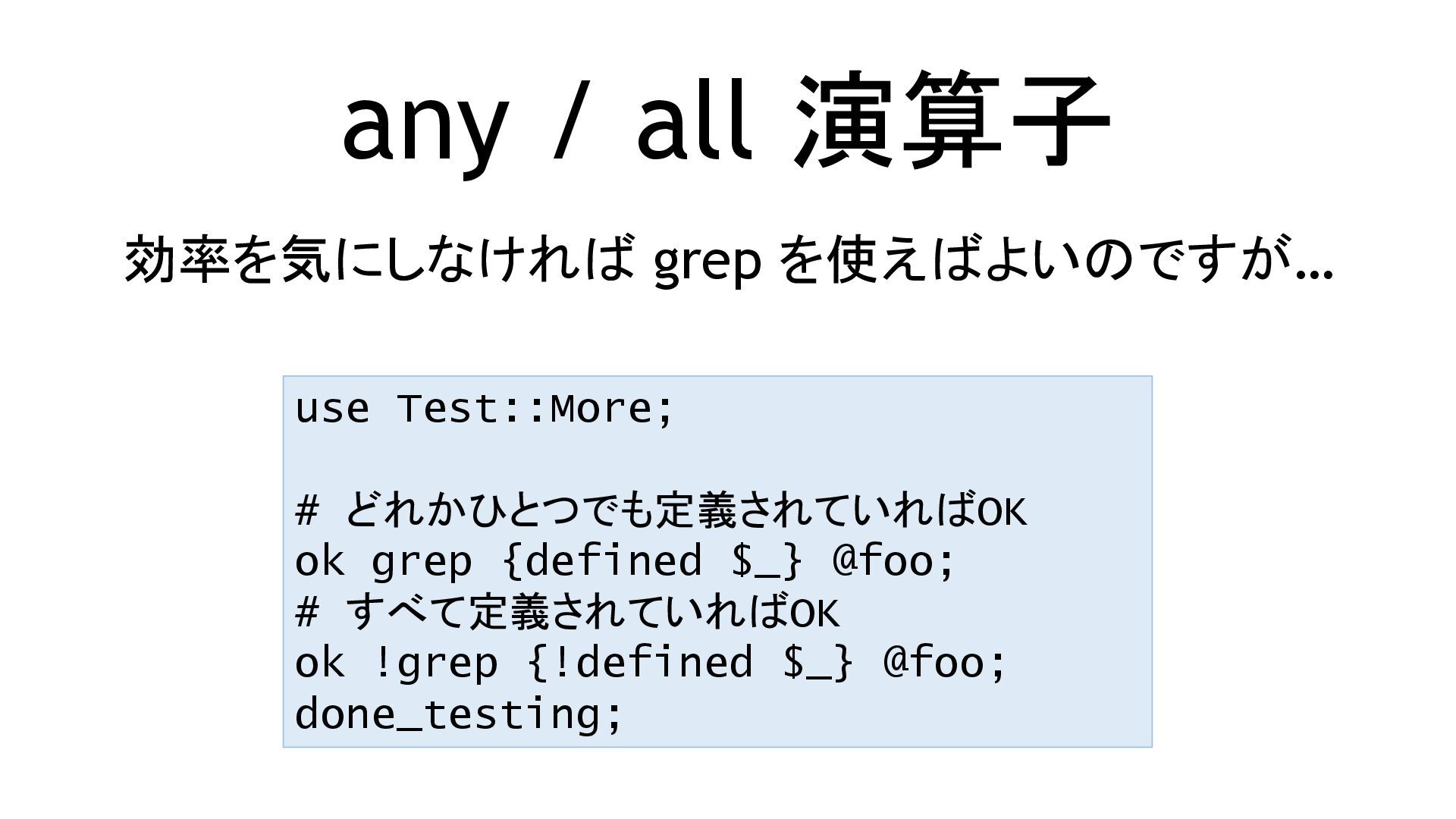 use experimental qw(keyword_any); use List::Util; use Benchmark qw(cmpthese); my @foo = (1..100000); cmpthese(10000, { grep => sub { grep {defined $_} @foo }, l_u => sub { List::Util::any {defined $_} @foo }, any => sub { any {defined $_} @foo }, }); Rate grep l_u any grep 300/s -- -81% -90% l_u 1565/s 422% -- -47% any 2941/s 881% 88% --