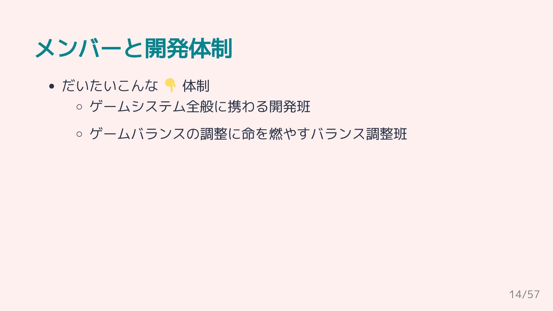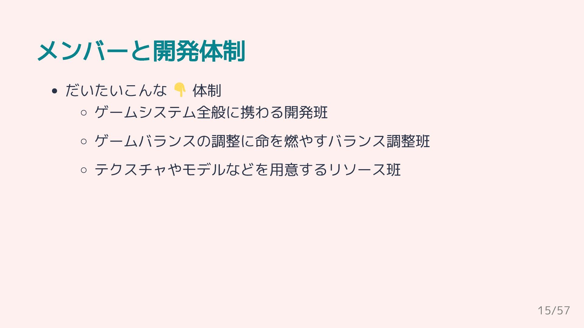 メンバーと開発体制 だいたいこんな 体制 ゲームシステム全般に携わる開発班 ゲームバランスの調整に命を燃やすバランス調整班 14/57