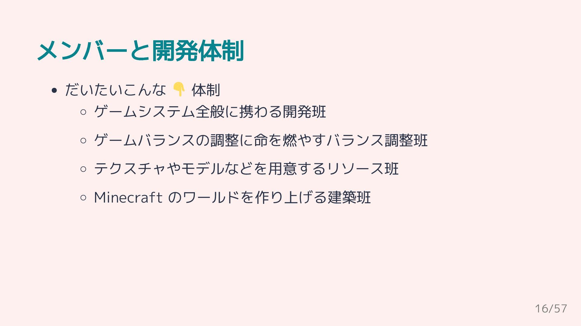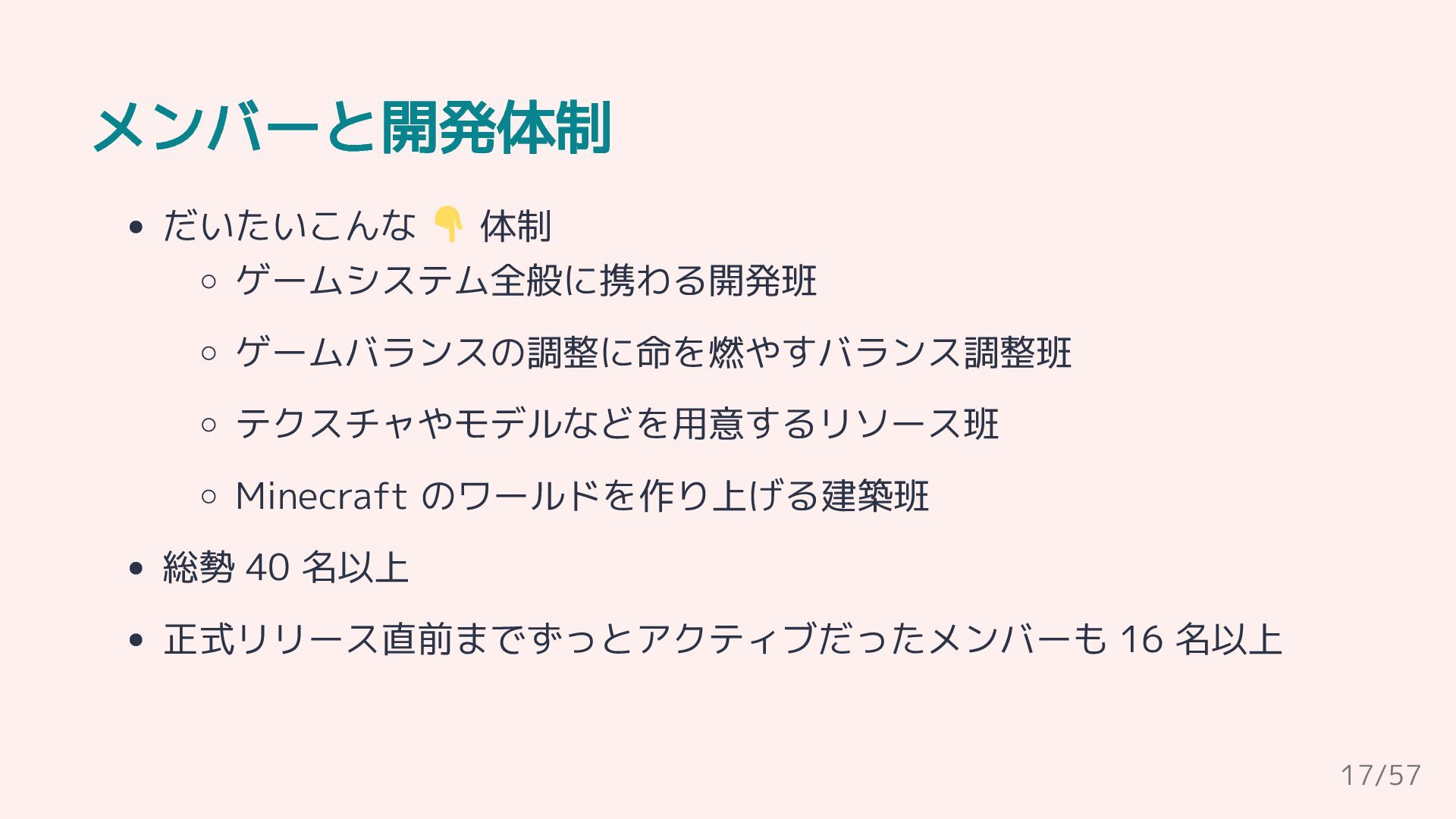 メンバーと開発体制 だいたいこんな 体制 ゲームシステム全般に携わる開発班 ゲームバランスの調整に命を燃やすバランス調整班 テクスチャやモデルなどを用意するリソース班 Minecraft のワールドを作り上げる建築班 16/57