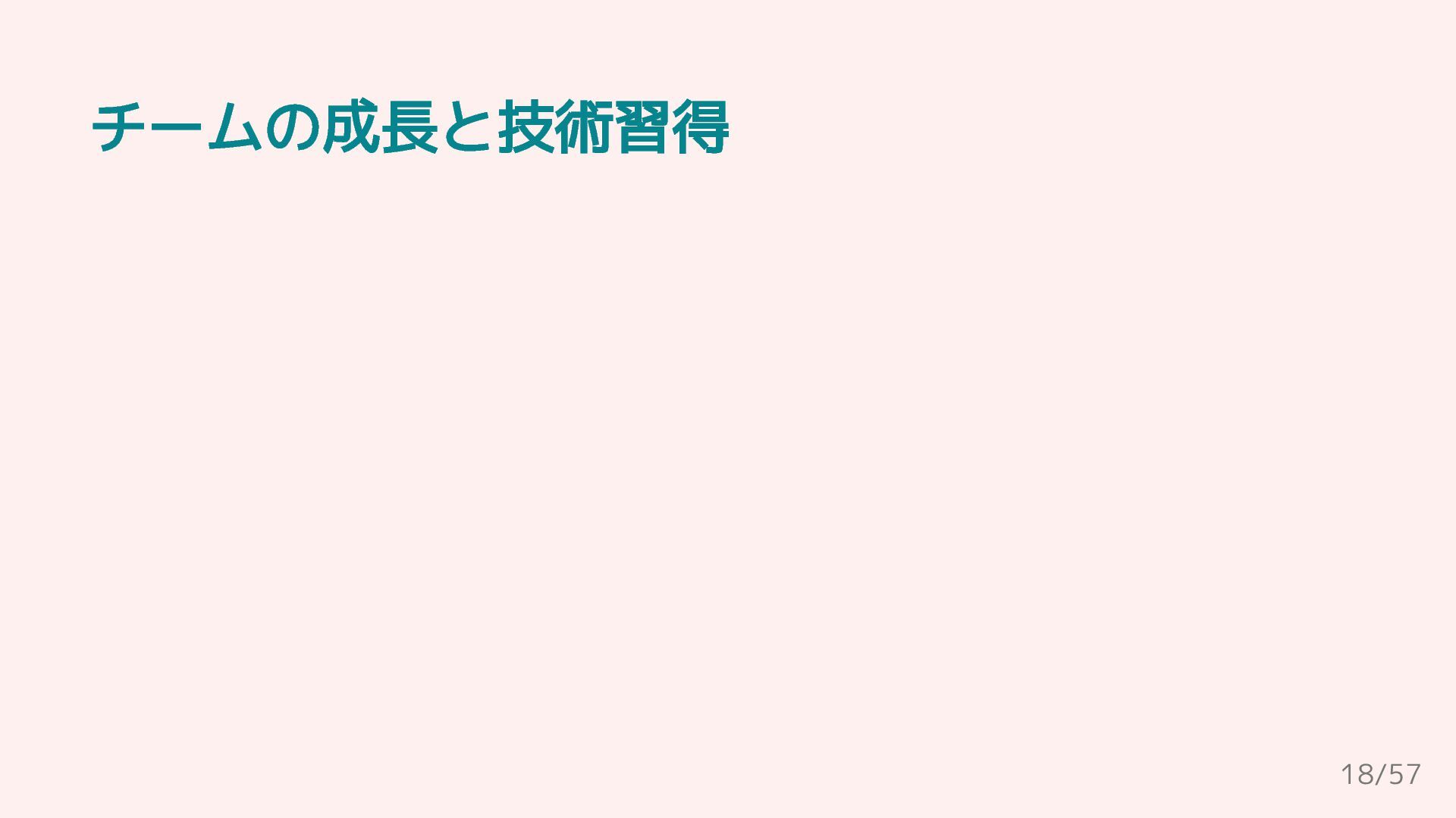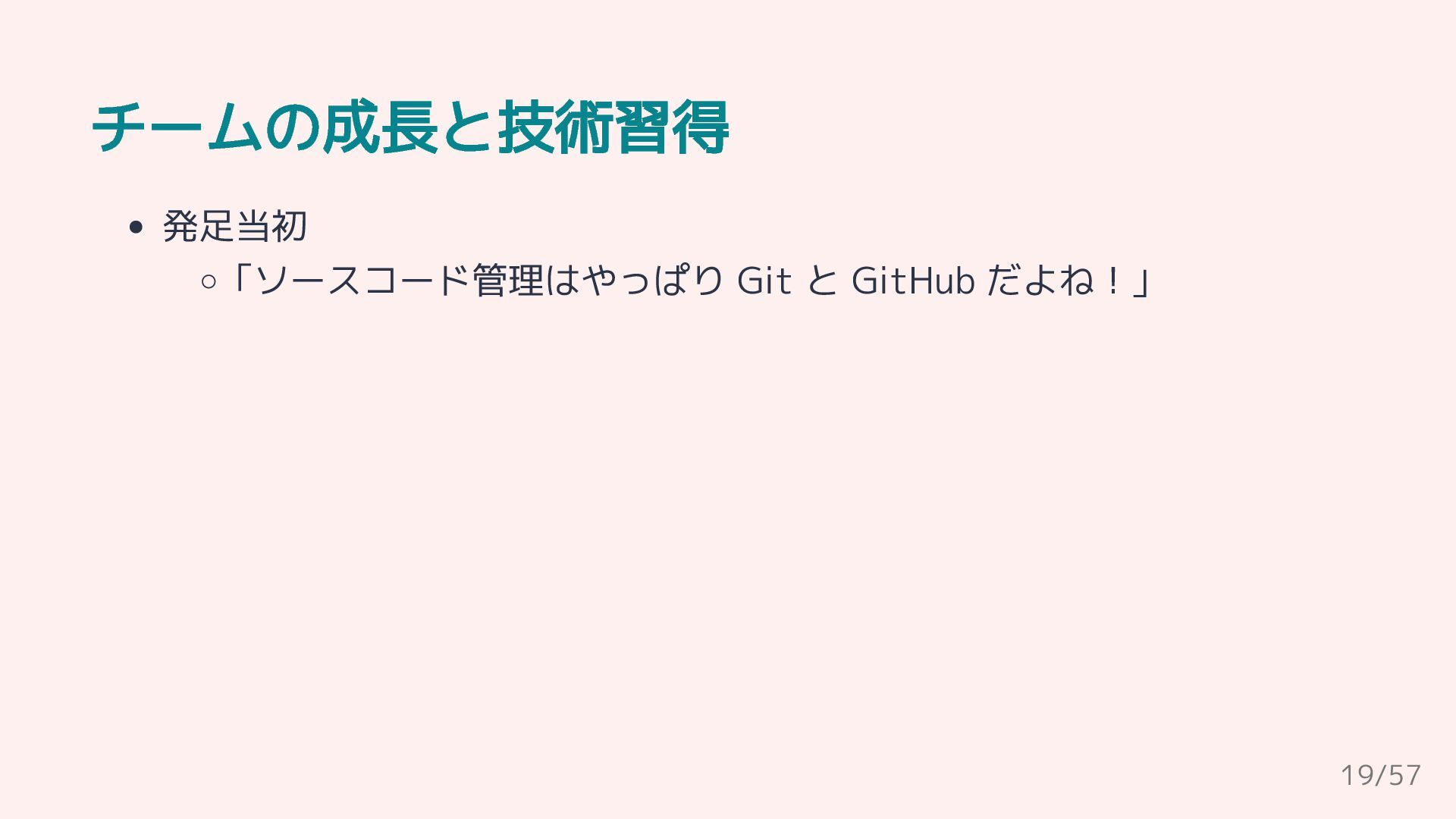 チームの成長と技術習得 発足当初 「ソースコード管理はやっぱり Git と GitHub だよね!」 19/57