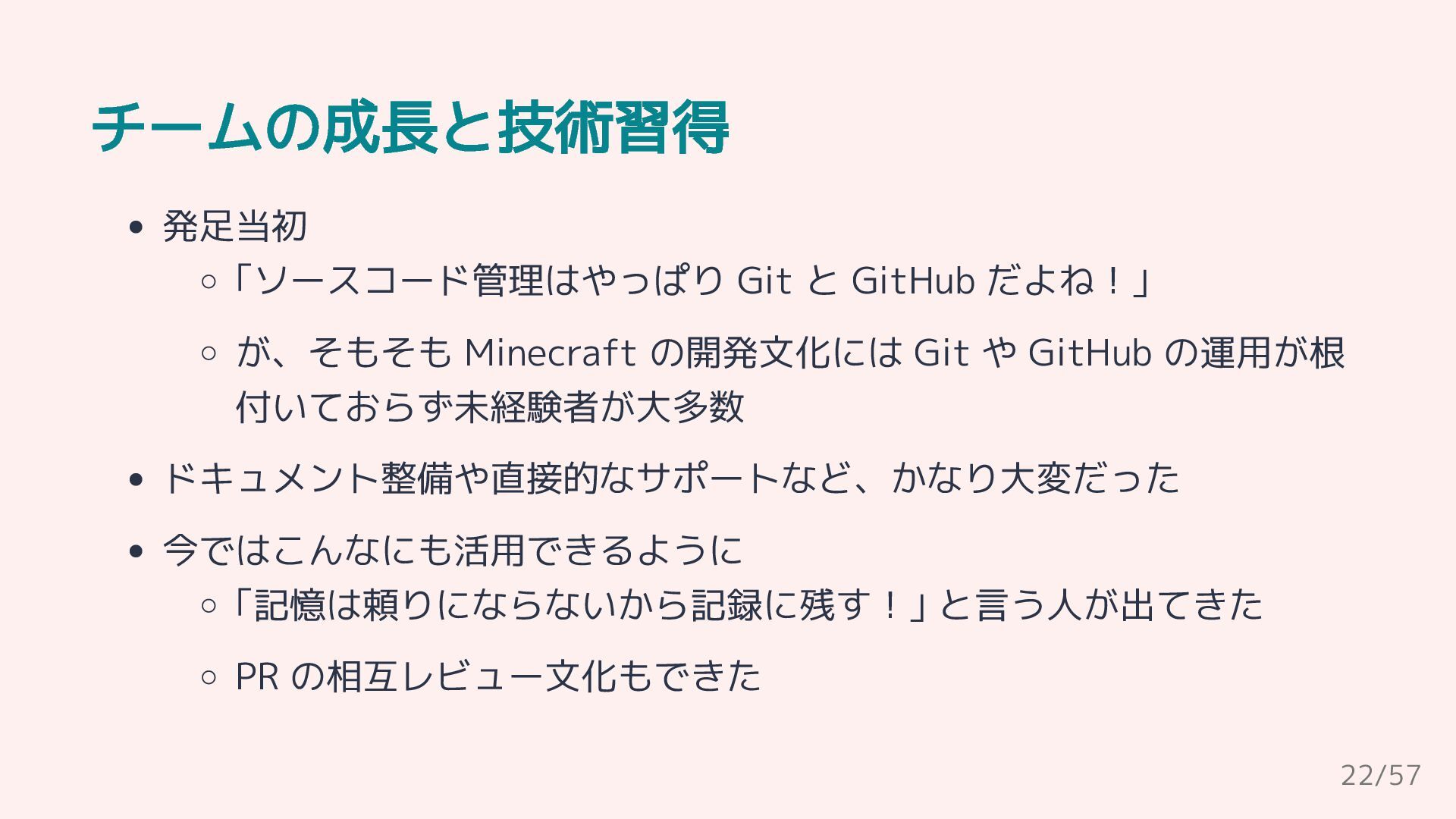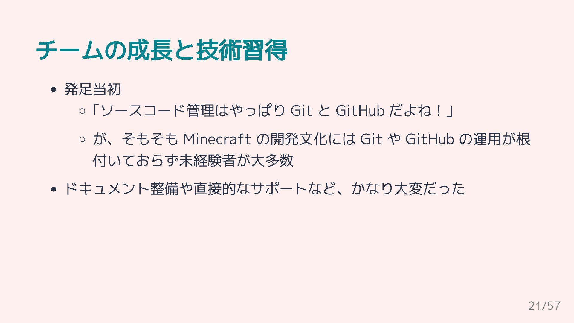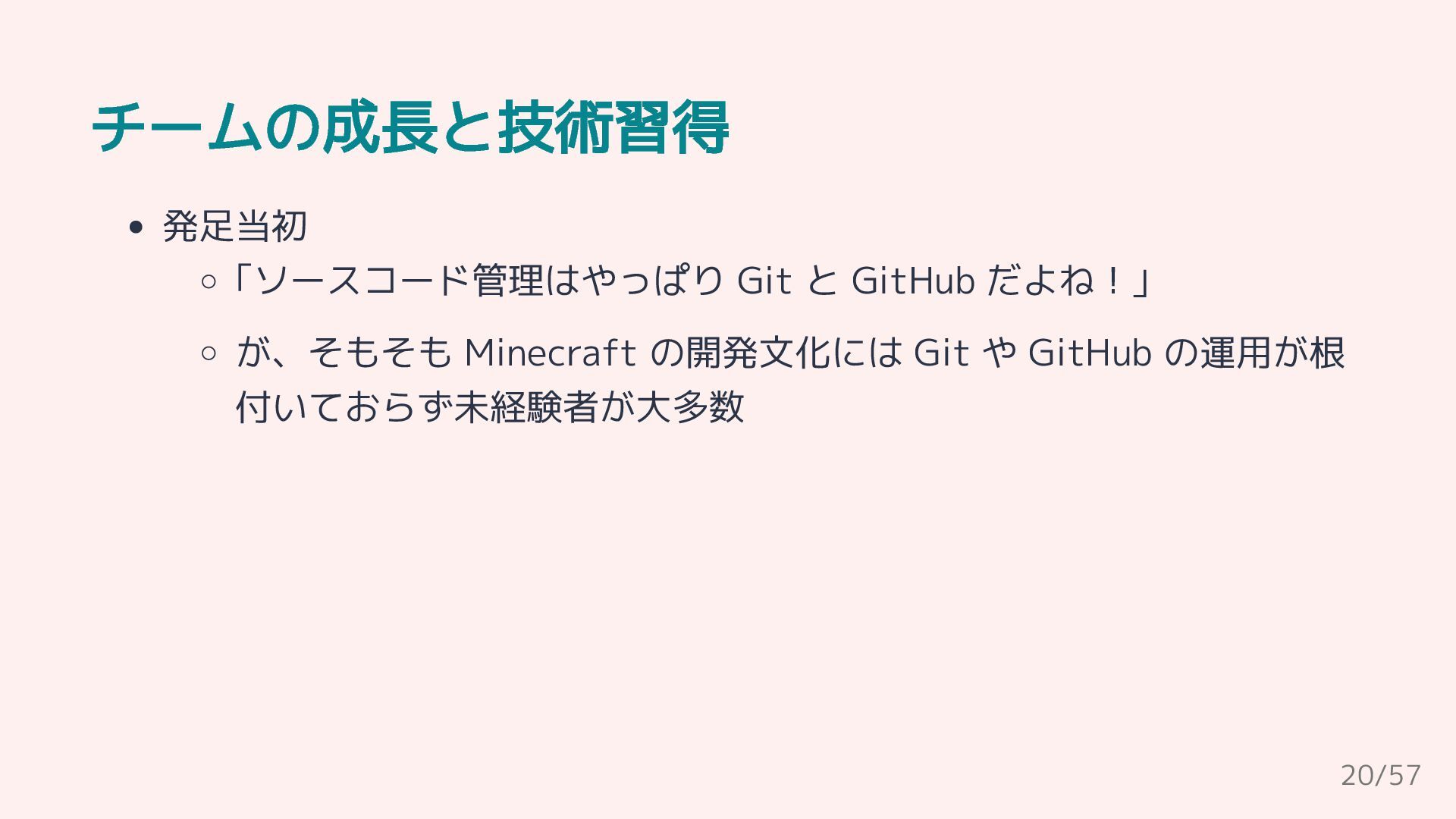 チームの成長と技術習得 発足当初 「ソースコード管理はやっぱり Git と GitHub だよね!」 が、そもそも Minecraft の開発文化には