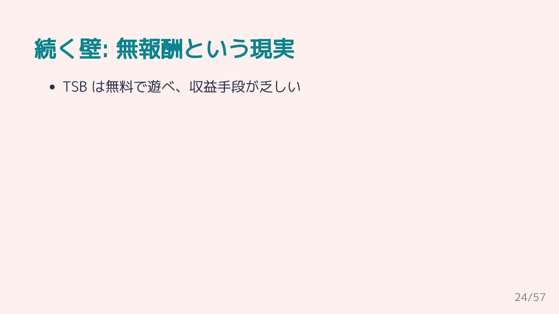 続く壁: 無報酬という現実 TSB は無料で遊べ、収益手段が乏しい 24/57