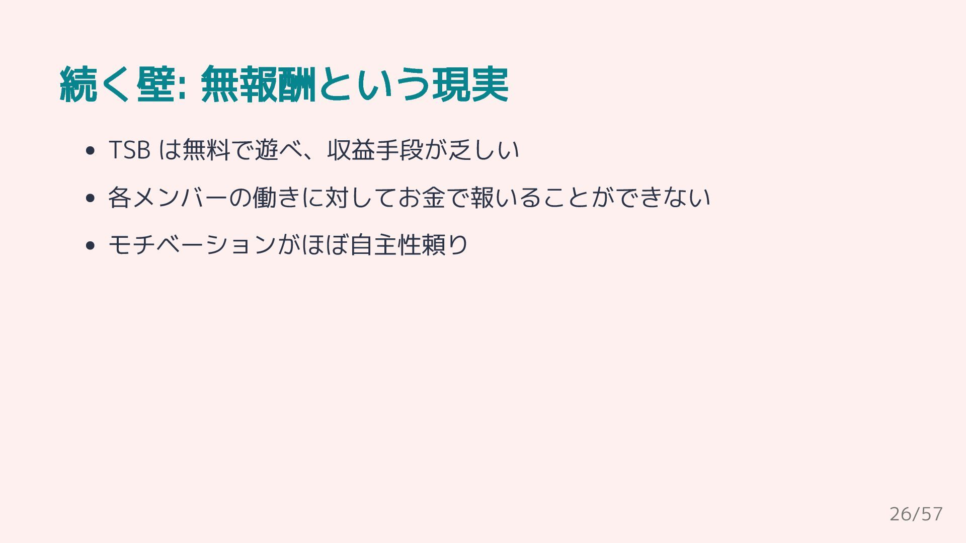 続く壁: 無報酬という現実 TSB は無料で遊べ、収益手段が乏しい 各メンバーの働きに対してお金で報いることができない モチベーションがほぼ自主性頼り 26/57
