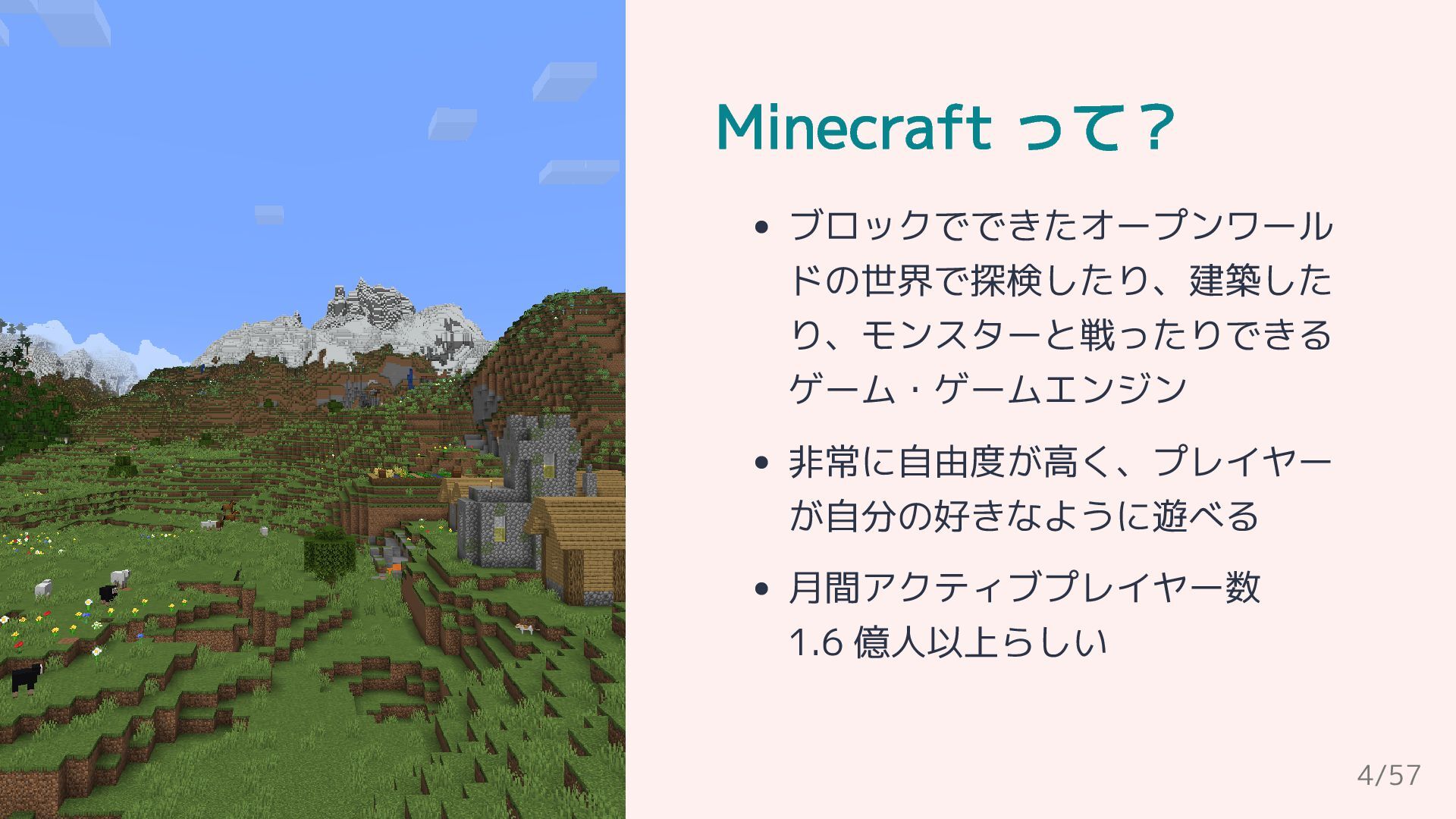 Minecraft って? ブロックでできたオープンワール ドの世界で探検したり、建築した り、モンスターと戦ったりできる ゲーム・ゲームエンジン 非常に自由度が高く、プレイヤー が自分の好きなように遊べる 月間アクティブプレイヤー数 1.6