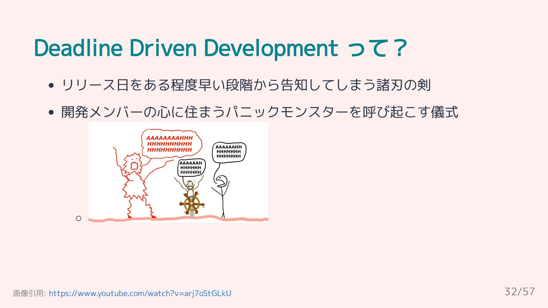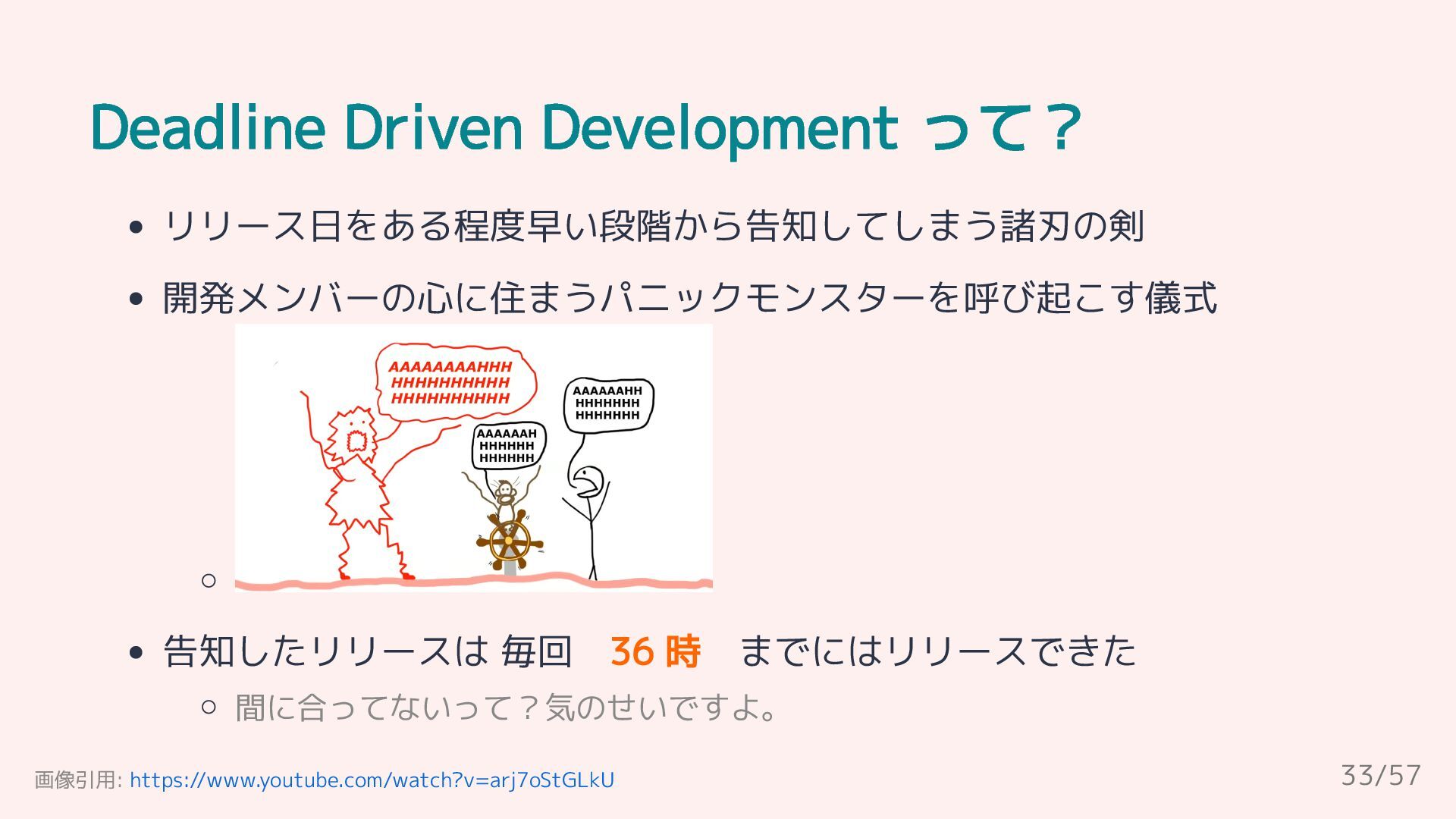 Deadline Driven Development って? リリース日をある程度早い段階から告知してしまう諸刃の剣 開発メンバーの心に住まうパニックモンスターを呼び起こす儀式 画像引用: https://www.youtube.com/watch?v=arj7oStGLkU 32/57
