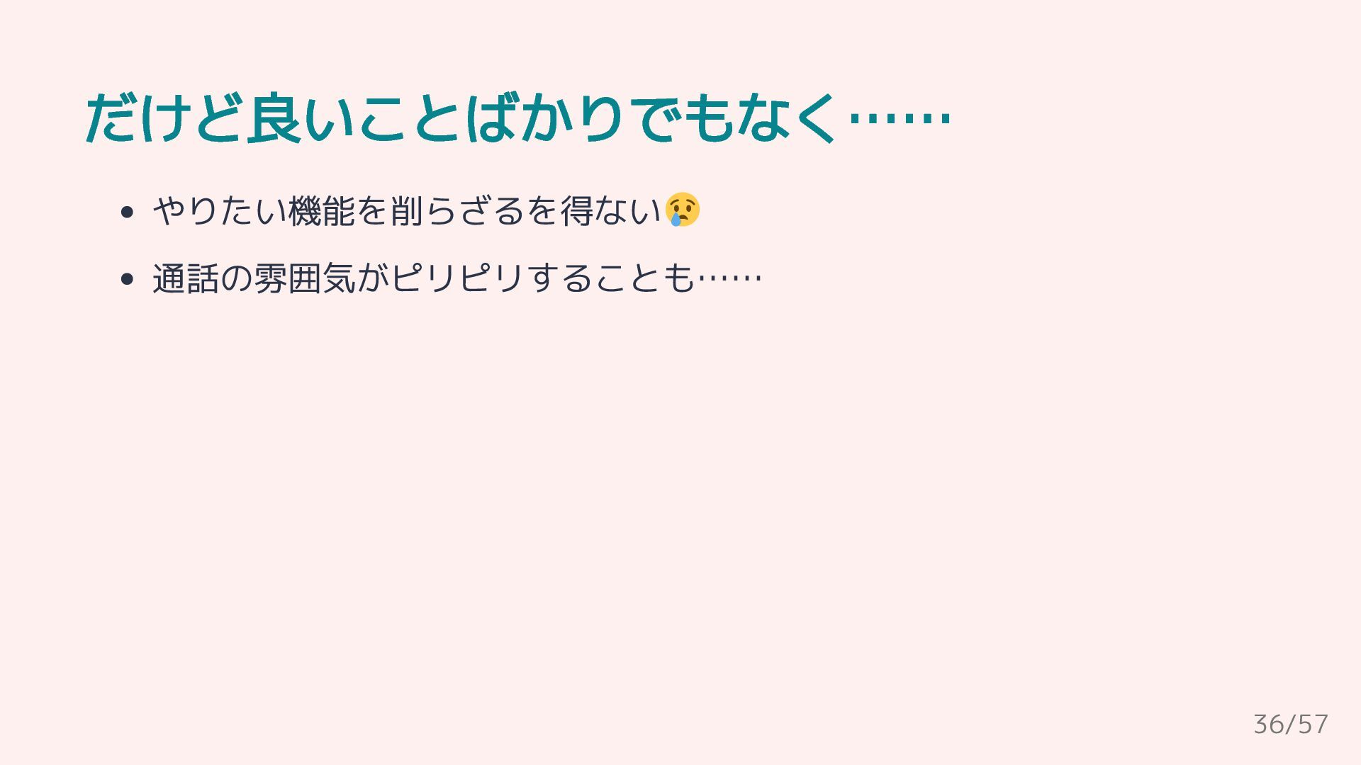 だけど良いことばかりでもなく…… やりたい機能を削らざるを得ない 通話の雰囲気がピリピリすることも…… 36/57