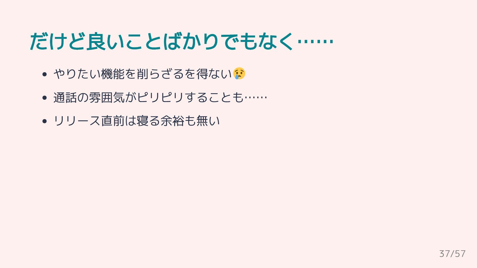 だけど良いことばかりでもなく…… やりたい機能を削らざるを得ない 通話の雰囲気がピリピリすることも…… リリース直前は寝る余裕も無い 37/57