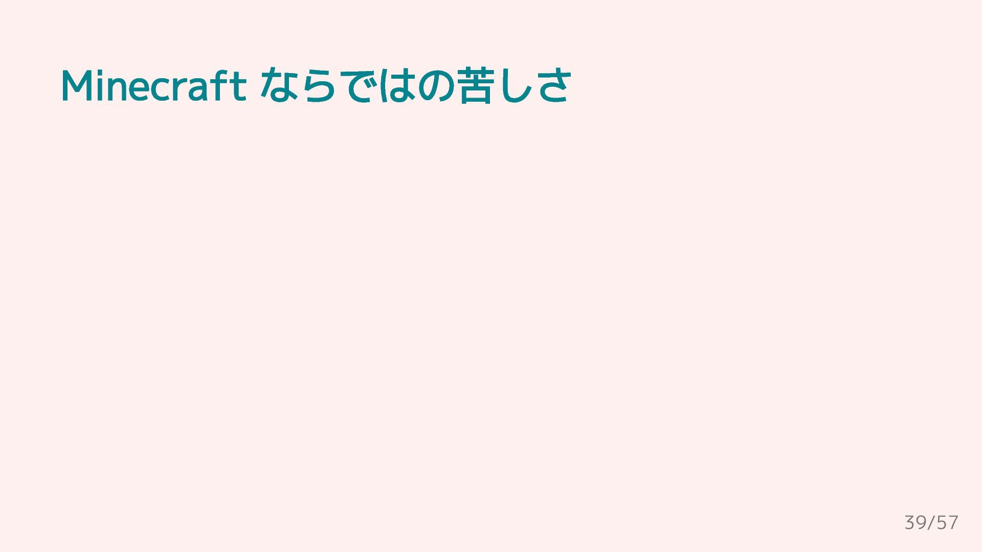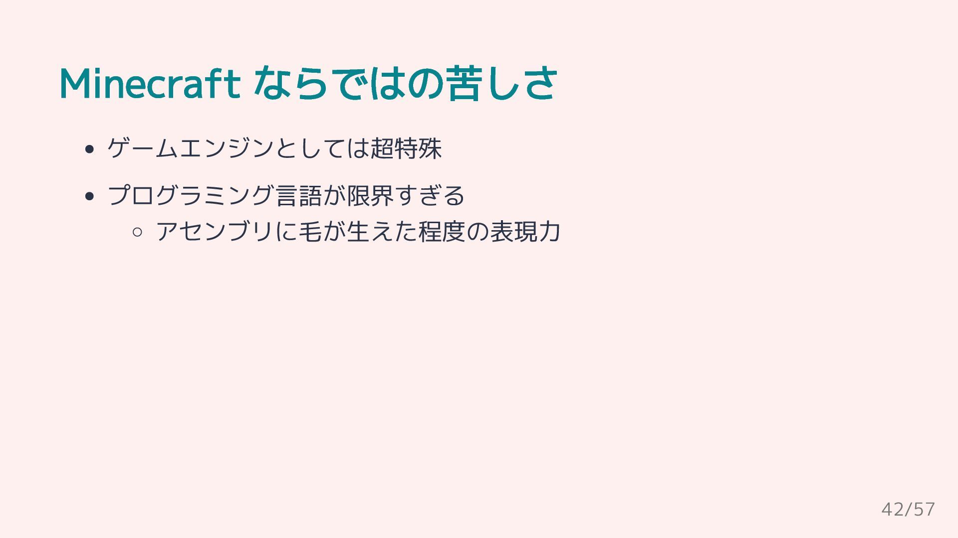 Minecraft ならではの苦しさ ゲームエンジンとしては超特殊 プログラミング言語が限界すぎる アセンブリに毛が生えた程度の表現力 複数人開発に非常に不向き 43/57