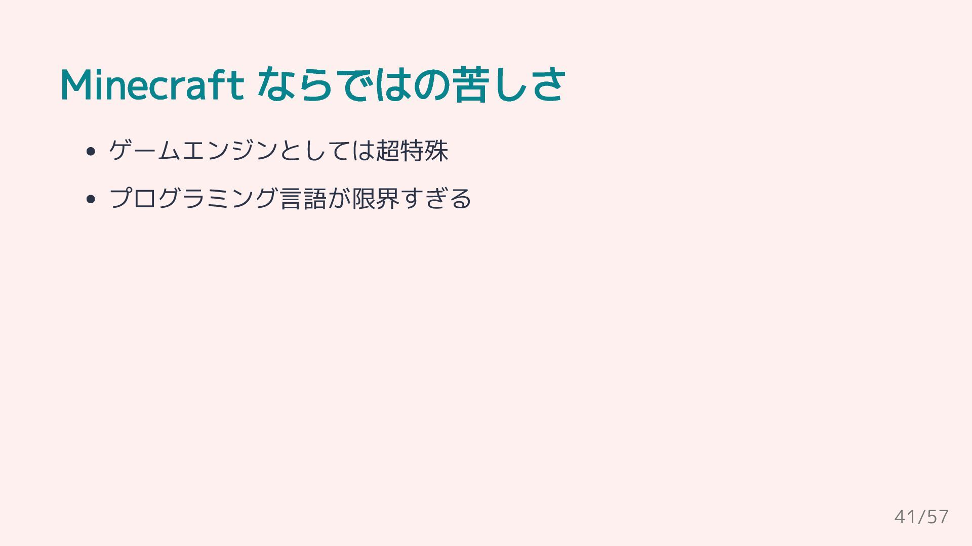 Minecraft ならではの苦しさ ゲームエンジンとしては超特殊 プログラミング言語が限界すぎる アセンブリに毛が生えた程度の表現力 42/57