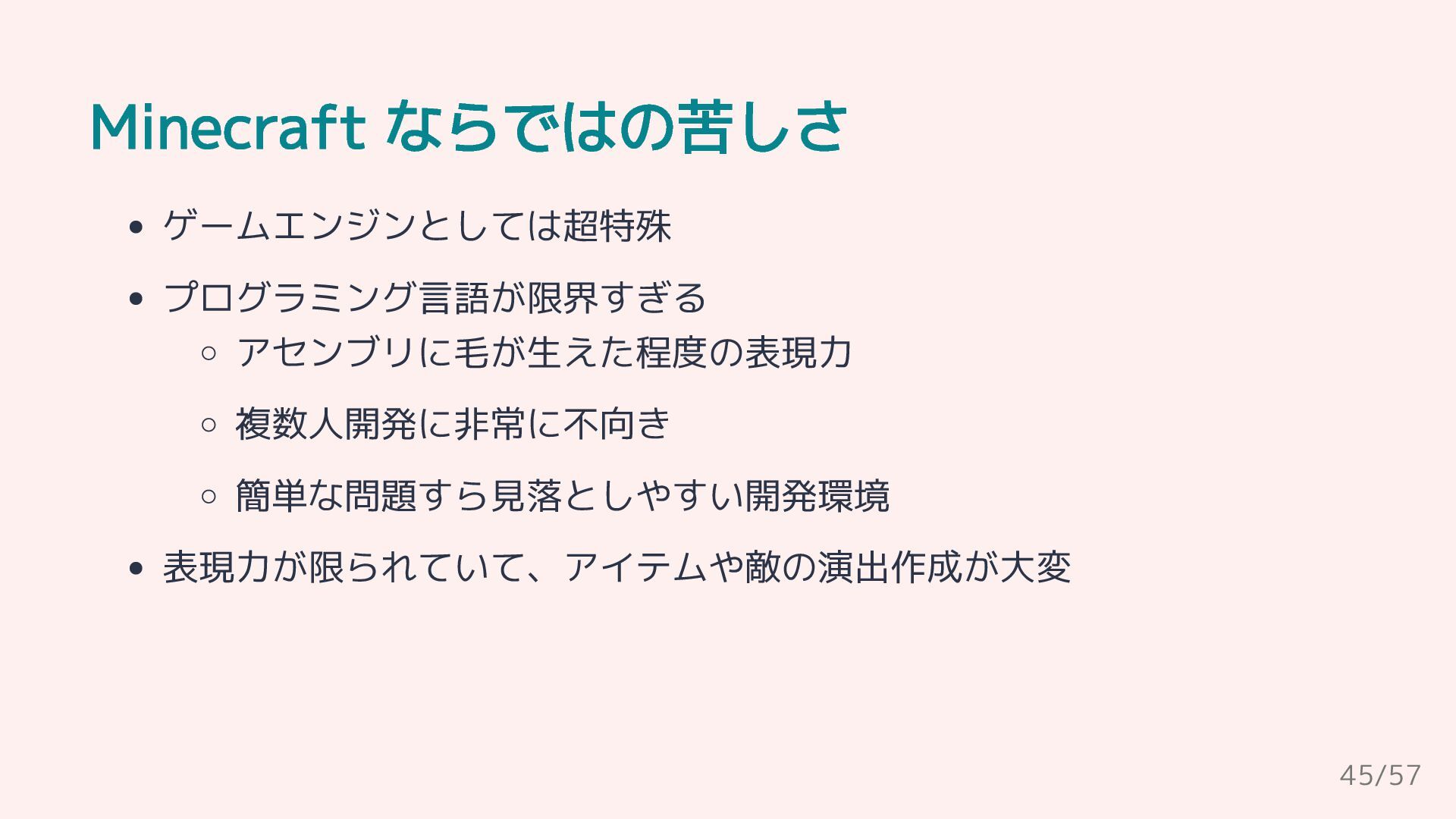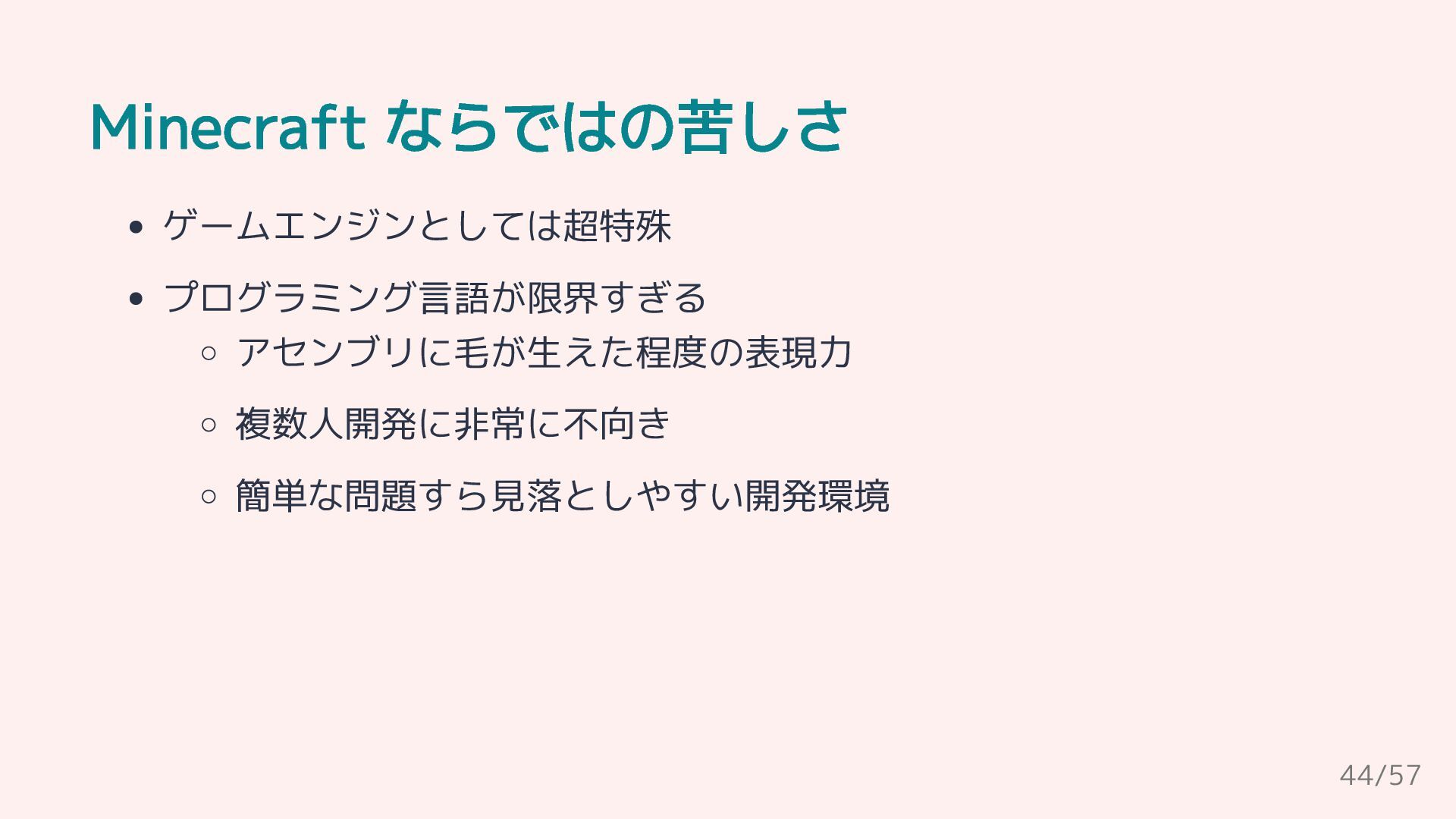 Minecraft ならではの苦しさ ゲームエンジンとしては超特殊 プログラミング言語が限界すぎる アセンブリに毛が生えた程度の表現力 複数人開発に非常に不向き 簡単な問題すら見落としやすい開発環境 44/57