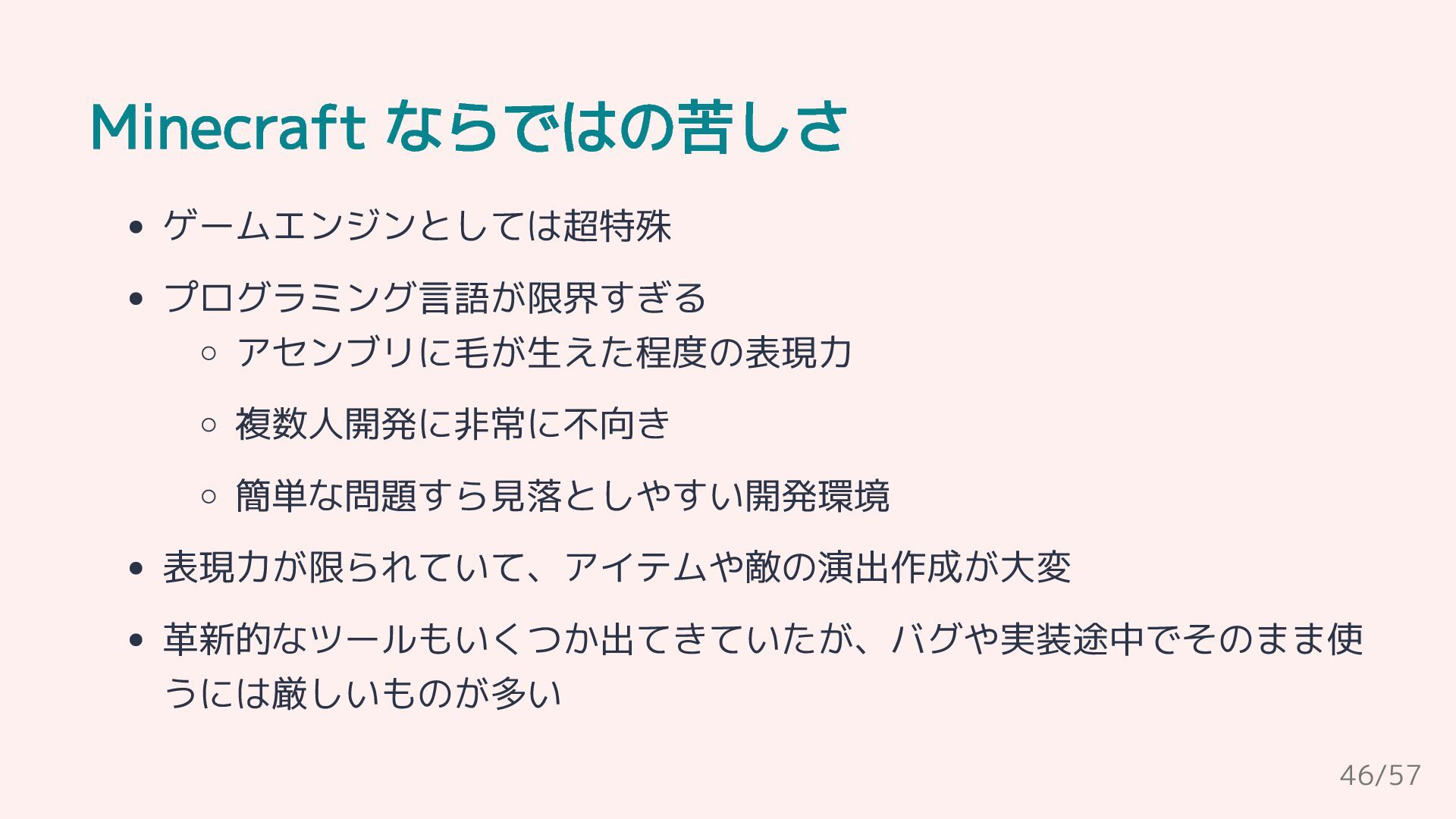 Minecraft ならではの苦しさ ゲームエンジンとしては超特殊 プログラミング言語が限界すぎる アセンブリに毛が生えた程度の表現力 複数人開発に非常に不向き 簡単な問題すら見落としやすい開発環境 表現力が限られていて、アイテムや敵の演出作成が大変 45/57