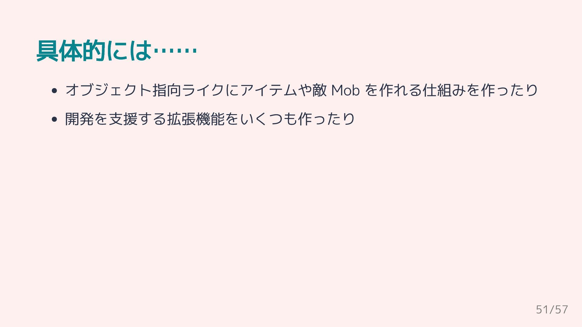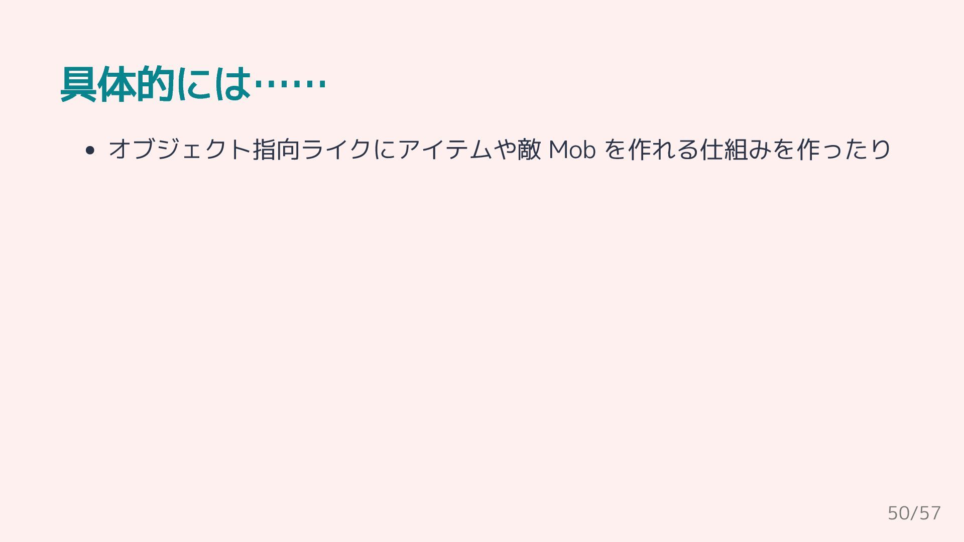 具体的には…… オブジェクト指向ライクにアイテムや敵 Mob を作れる仕組みを作ったり 50/57