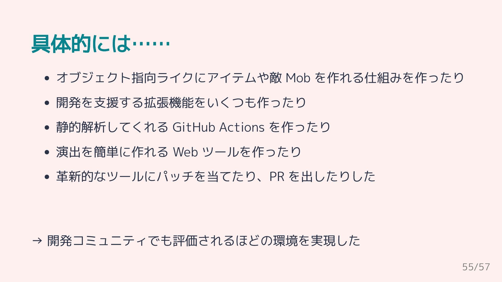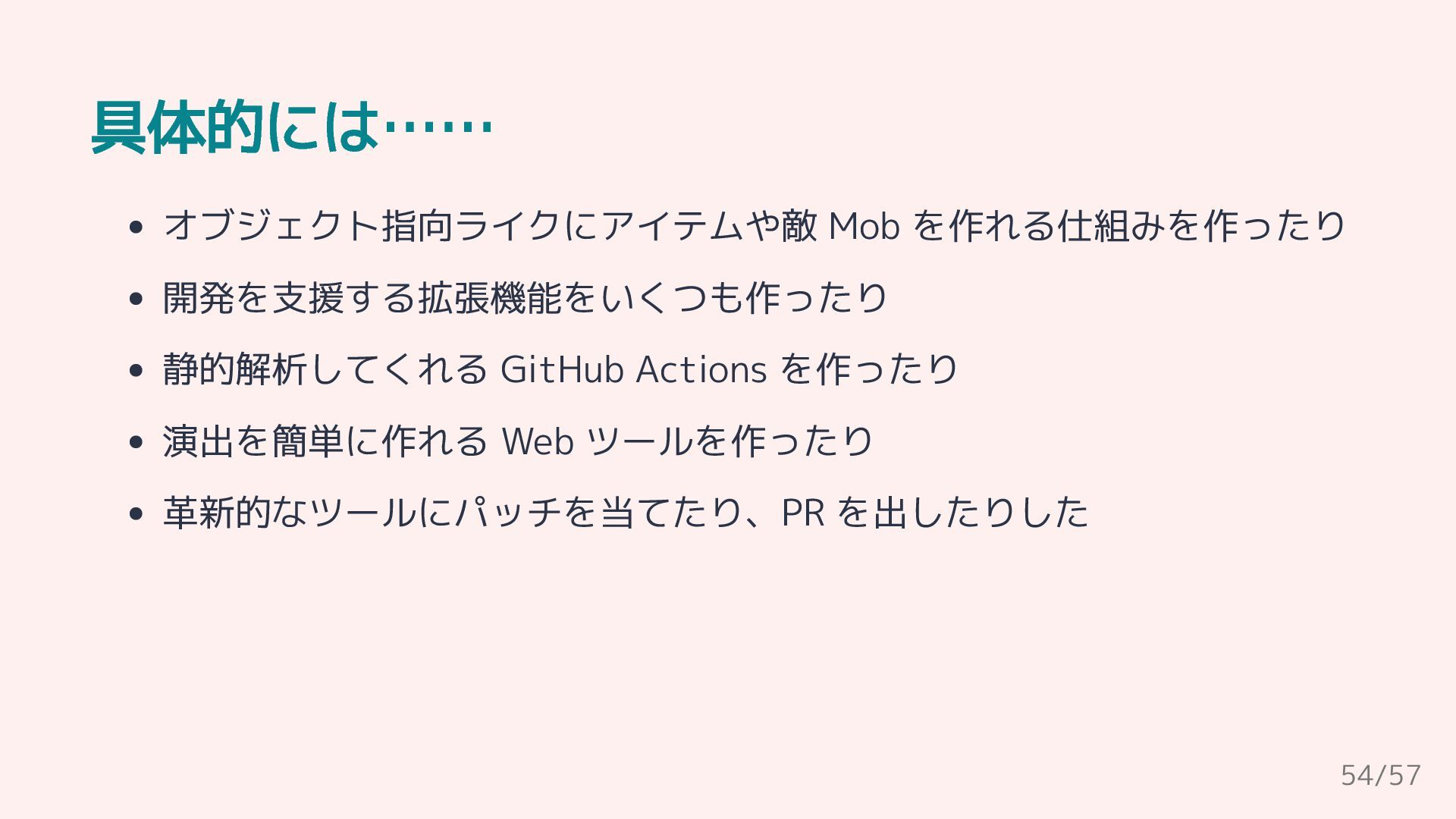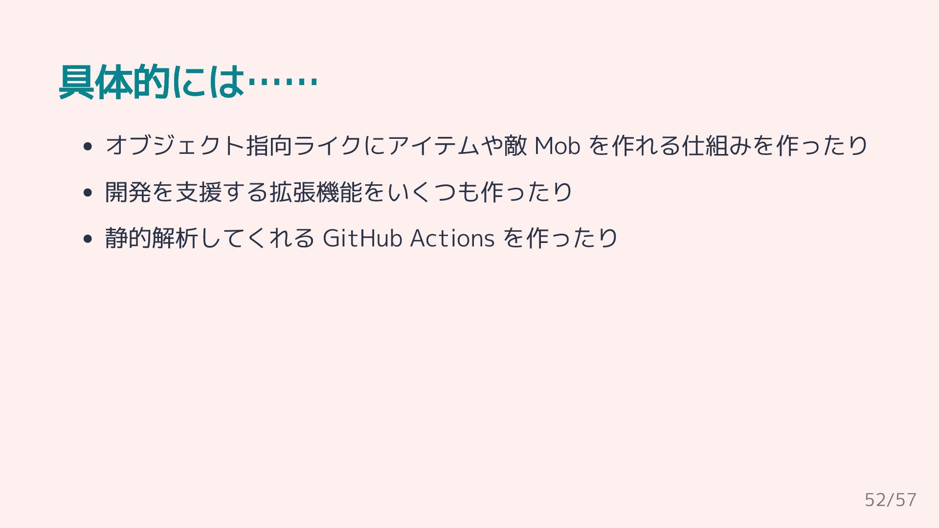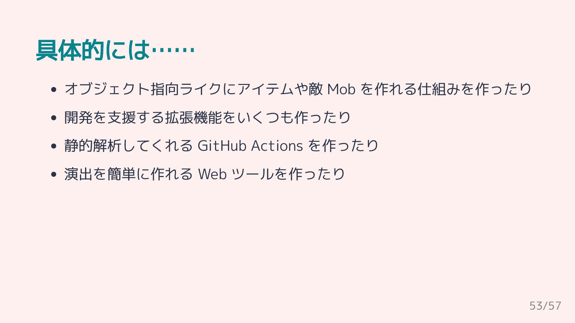 具体的には…… オブジェクト指向ライクにアイテムや敵 Mob を作れる仕組みを作ったり 開発を支援する拡張機能をいくつも作ったり 静的解析してくれる GitHub Actions を作ったり 52/57