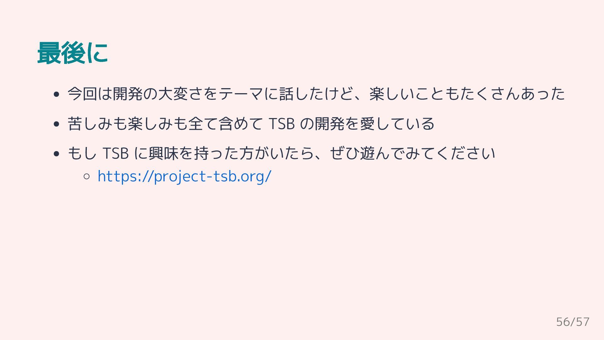 最後に 今回は開発の大変さをテーマに話したけど、楽しいこともたくさんあった 苦しみも楽しみも全て含めて TSB の開発を愛している もし TSB に興味を持った方がいたら、ぜひ遊んでみてください https://project-tsb.org/ 56/57