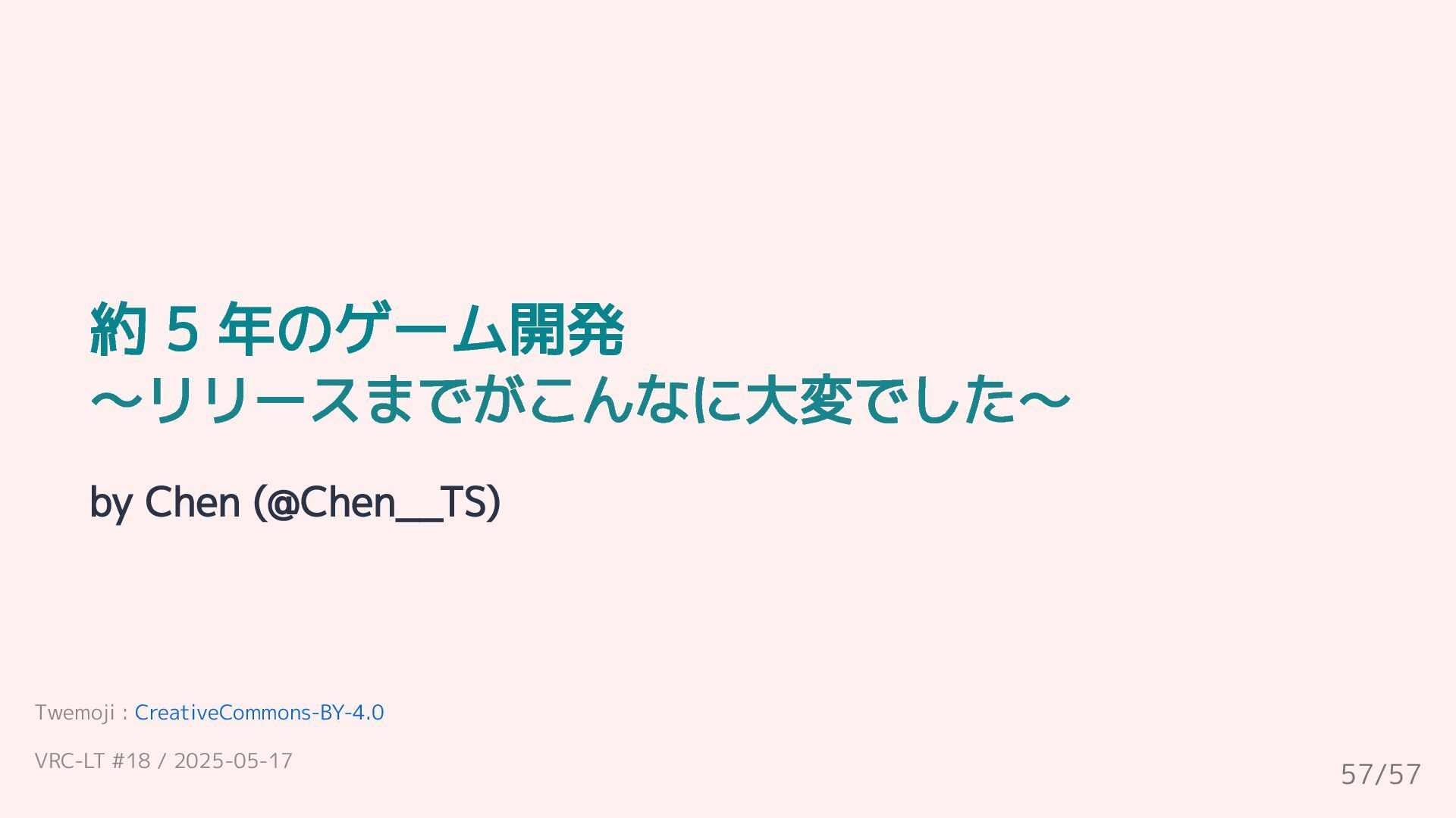 約 5 年のゲーム開発 〜リリースまでがこんなに大変でした〜 by Chen (@Chen__TS) Twemoji : CreativeCommons-BY-4.0