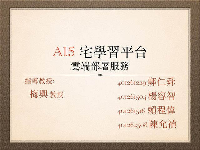 A15 宅學習平台 雲端部署服務 指導教授: 梅興 教授 401261229 鄭仁舜 401261504 楊容智