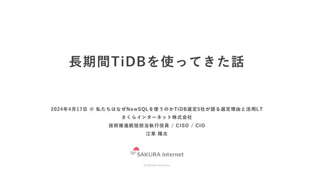 • 2021年6⽉ v5.1.0 にアップデート • 2021年7⽉ v5.1.1 にアップデート (EDB提供開始) • 2022年1⽉ v5.3.0 にアップデート • 2022年5⽉ v5.4.1 にアップデート • 2022年10⽉ v6.1.1 にアップデート • 2023年3⽉ v6.5.1 にアップデート • 2023年4⽉ 東京リージョンでの提供開始 • 2023年6⽉ v7.1.0 にアップデート • 2023年7⽉ TiFlashノードを構築 (⾃社利⽤⽬的) • 2023年10⽉ v7.1.1 にアップデート • 2023年10⽉ v7.1.2 にアップデート • 2024年1⽉ v7.5.0 にアップデート 🎉 祝 8.0 compatible !