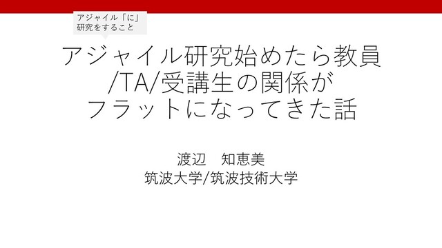 アジャイル研究始めたら教員 /TA/受講⽣の関係が フラットになってきた話 渡辺 知恵美 筑波⼤学/筑波技術⼤学 アジャイル「に」 研究をすること