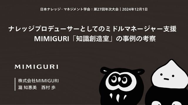日本ナレッジ・マネジメント学会 第27回年次大会(2024年12月1日)にて研究発表したもの。 本研究では、株式会社MIMIGURIの知識創造室の事例をもとに、ミドルマネージャーがナレッジプロデューサーとして、チーム内の知識創造を促進するために必要な、組織的な支援の仕組みについて考察した。