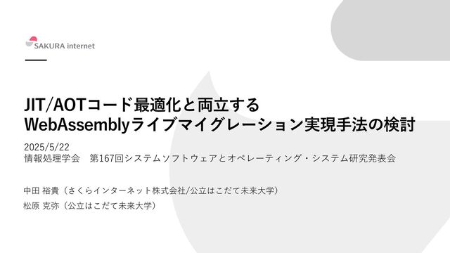 実行時間(秒) Wasm3 83.53 セルフホストWasm3 on Wasm3 3125.61 Wasmtime 14.02 セルフホストWasm3 on Wasmtime 1579.32 37倍 112倍 ベンチマーク実行結果[5] [5] Y. Nakata and K. Matsubara, “Poster: Feasibility of Runtime-Neutral Wasm Instrumentation for Edge-Cloud Workload Handover”, pp. 528–530, Dec. 2024, doi: https://doi.org/10.1109/sec62691.2024.00068.