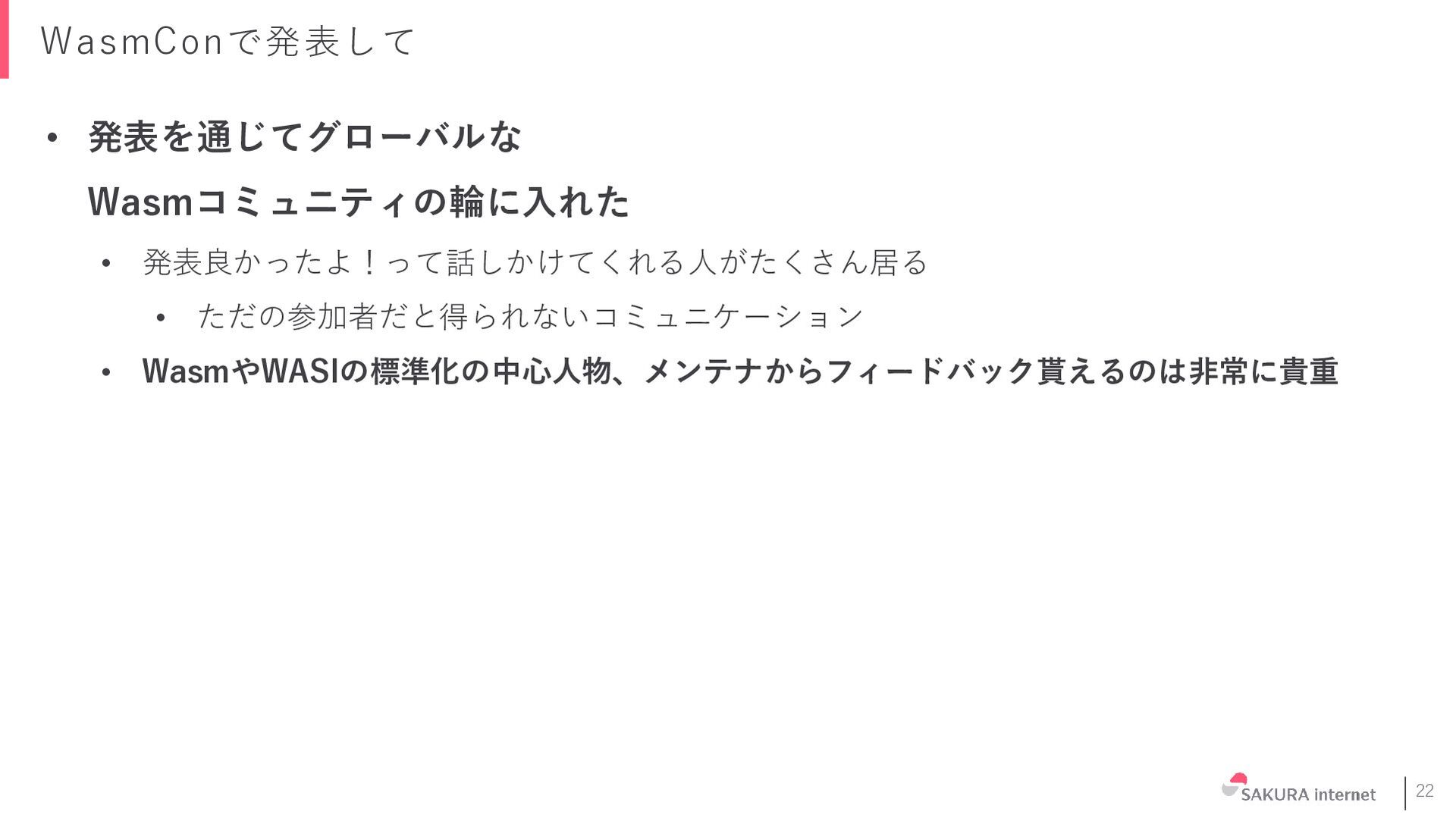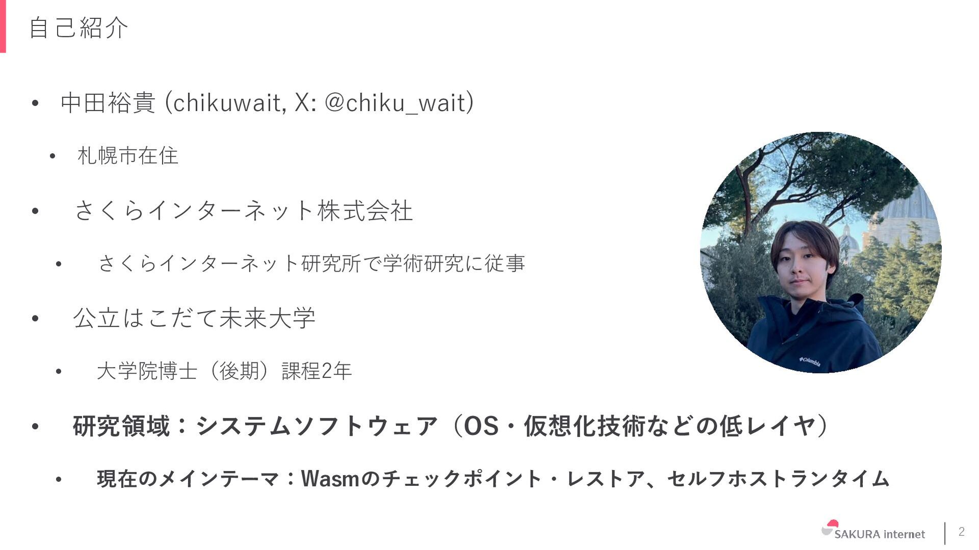 さくらインターネット株式会社 • さくらインターネット研究所で学術研究に従事 • 公立はこだて未来大学 • 大学院博士(後期)課程2年 • 研究領域:システムソフトウェア(OS・仮想化技術などの低レイヤ) • 現在のメインテーマ:Wasmのチェックポイント・レストア、セルフホストランタイム