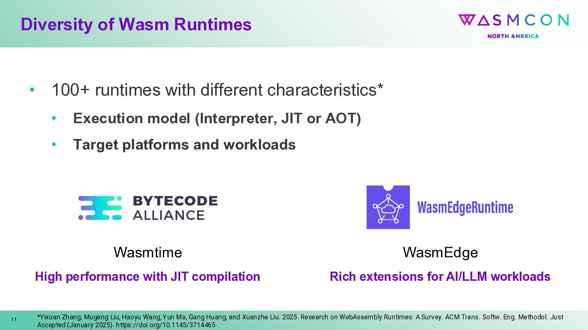 characteristics* • Execution model (Interpreter, JIT or AOT) • Target platforms and workloads *Yixuan Zhang, Mugeng Liu, Haoyu Wang, Yun Ma, Gang Huang, and Xuanzhe Liu. 2025. Research on WebAssembly Runtimes: A Survey. ACM Trans. Softw. Eng. Methodol. Just Accepted (January 2025). https://doi.org/10.1145/3714465 Wasmtime High performance with JIT compilation WasmEdge Rich extensions for AI/LLM workloads