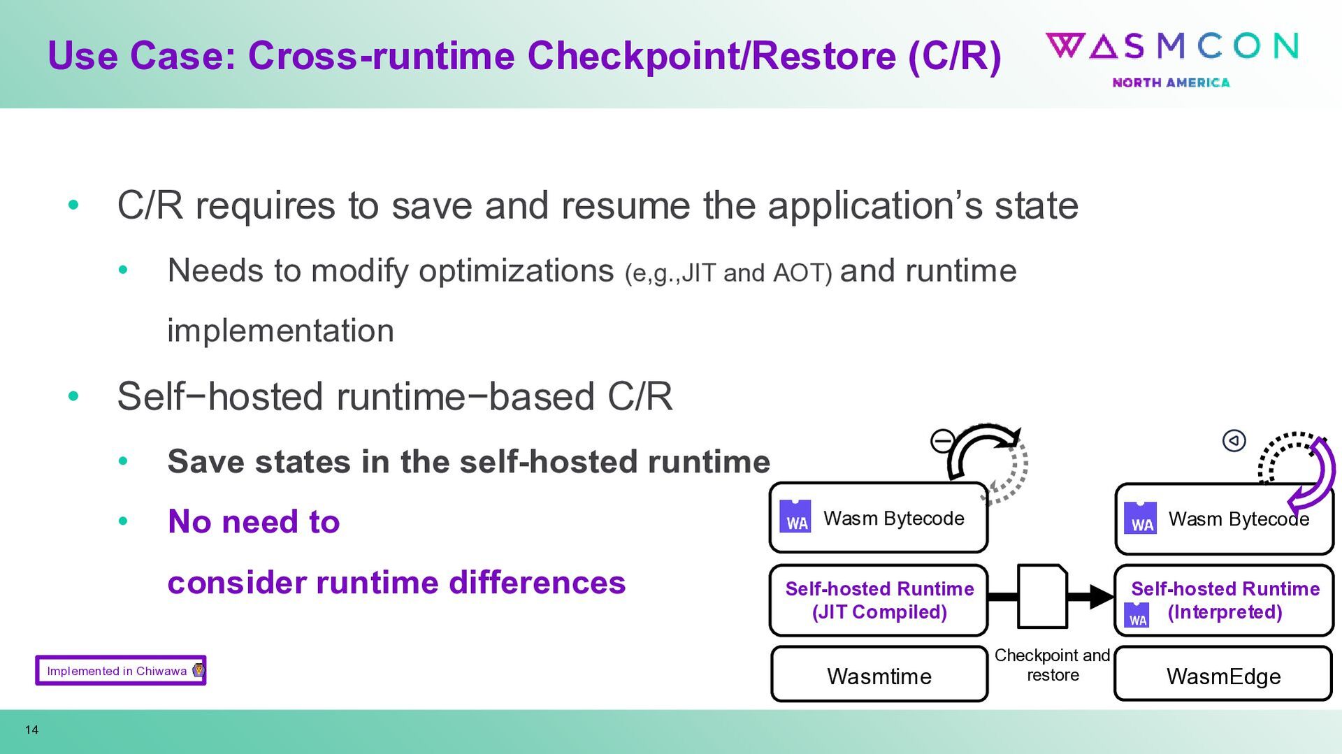11. 14 Use Case: Cross-runtime Checkpoint/Restore (C/R) • C/R requires to