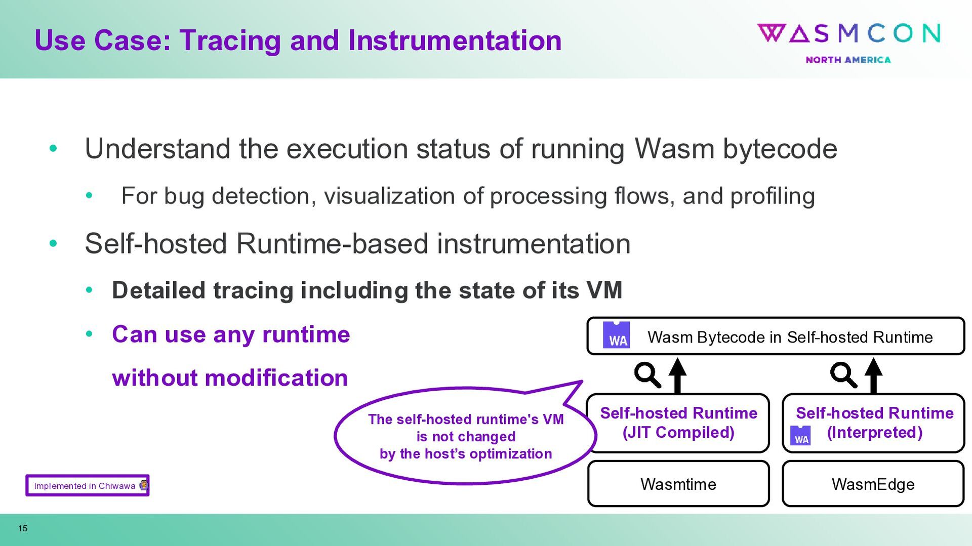 status of running Wasm bytecode • For bug detection, visualization of processing flows, and profiling • Self-hosted Runtime-based instrumentation • Detailed tracing including the state of its VM • Can use any runtime without modification Implemented in Chiwawa Self-hosted Runtime (JIT Compiled) Wasmtime Wasm Bytecode in Self-hosted Runtime WasmEdge Self-hosted Runtime (Interpreted) The self-hosted runtime's VM is not changed by the host’s optimization