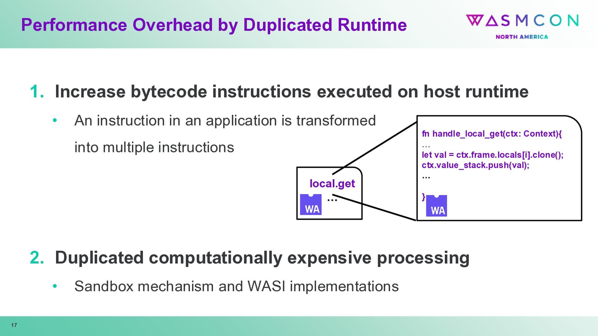 executed on host runtime • An instruction in an application is transformed into multiple instructions 2. Duplicated computationally expensive processing • Sandbox mechanism and WASI implementations local.get … fn handle_local_get(ctx: Context){ … let val = ctx.frame.locals[i].clone(); ctx.value_stack.push(val); … }